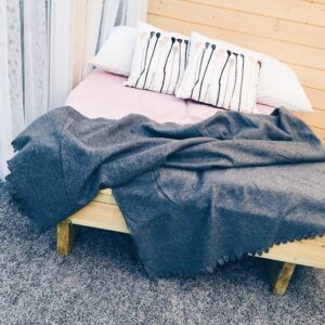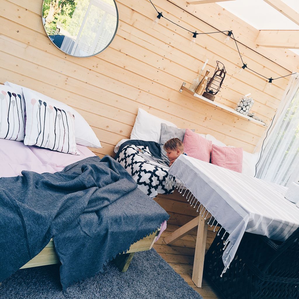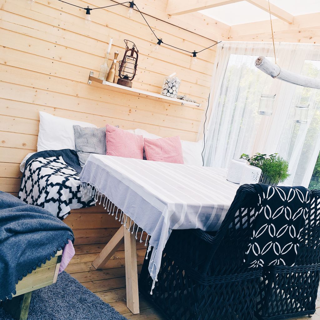 Vilosängen inne i uterummet blev riktigt bra faktiskt. En lurvig matta blev lite pricken över i:et därinne faktiskt. Höjde mysfaktorn avsevärt. Ska ställa ett brickbord bredvid sängen också så man kan ställa sin kopp the, glas rosé eller ölen där. Hur mysigt!