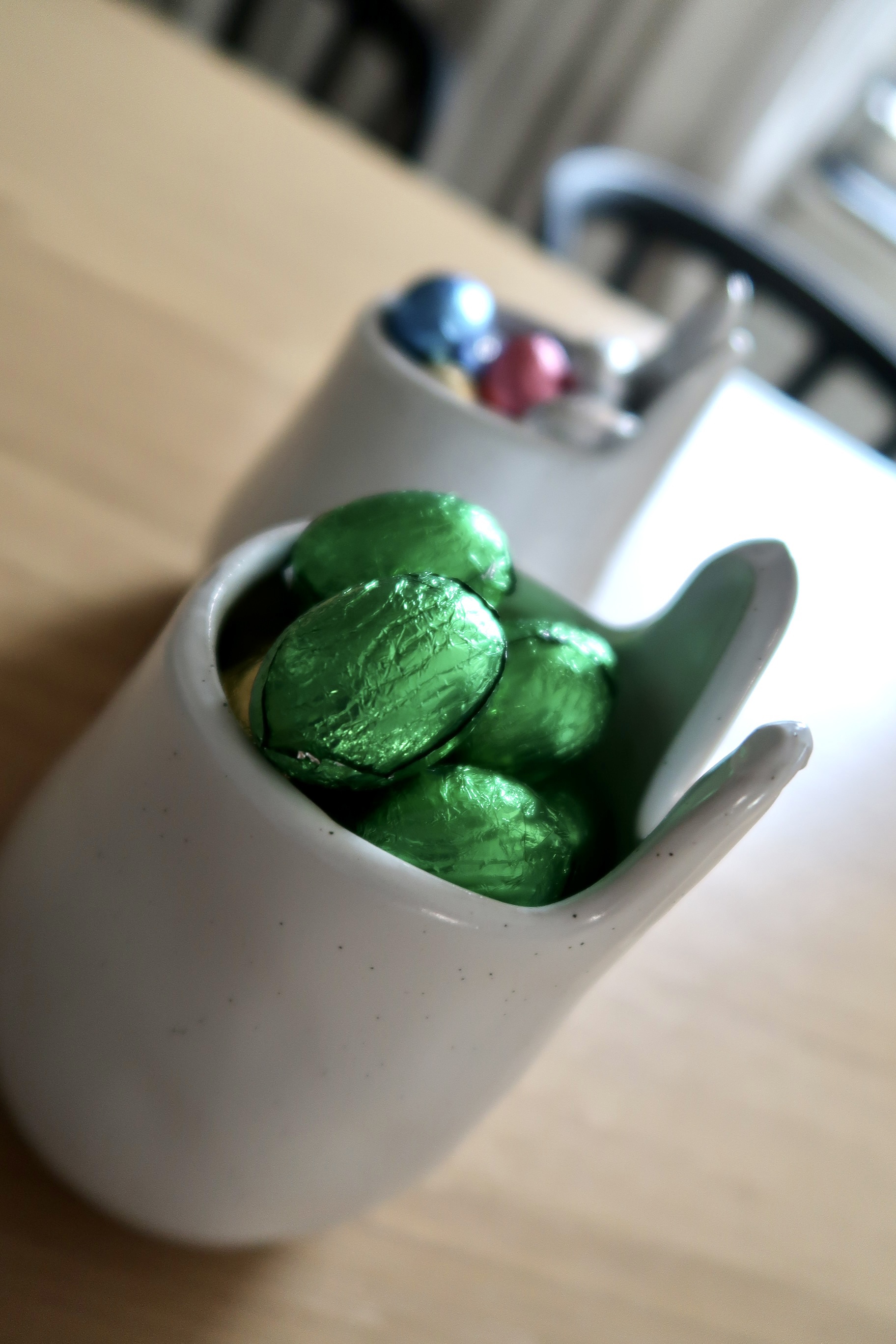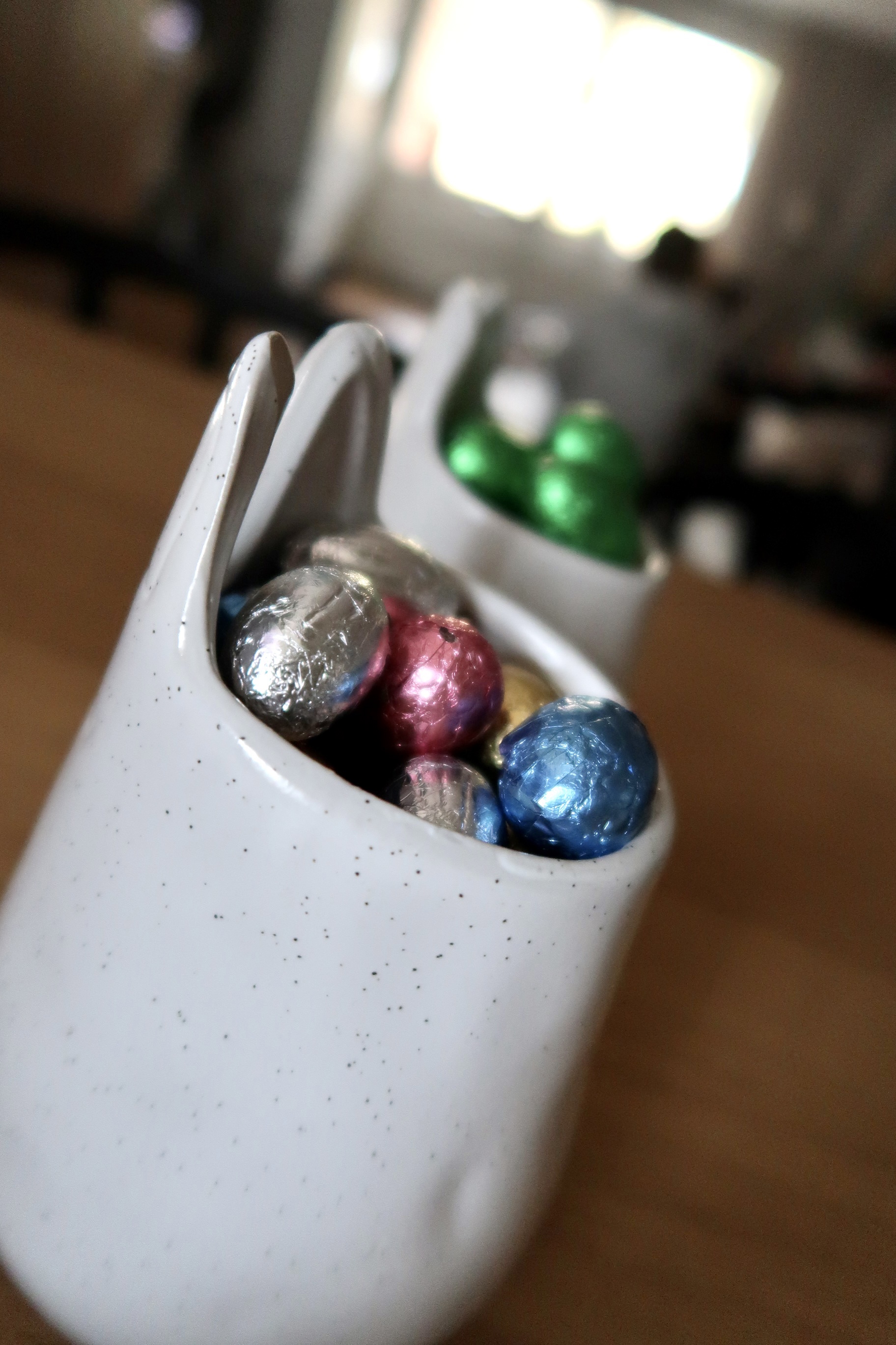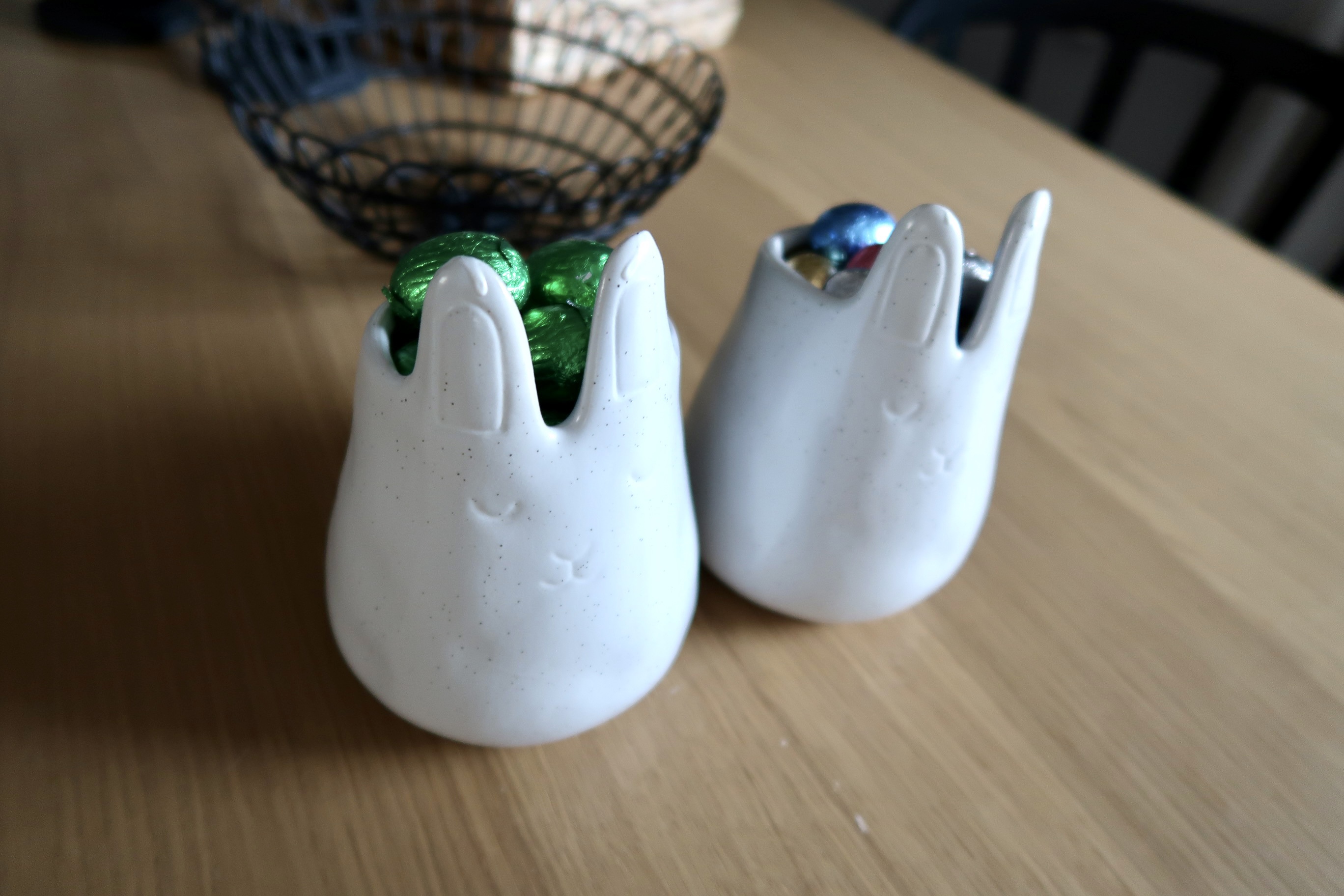 Lite påskpynt lyckades jag i alla fall få ihop med två harkrukor med godis på bordet.