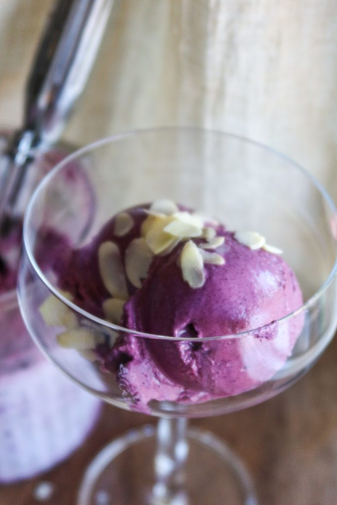 Den här glassen är vegansk, naturligt sötad med honung och så har jag fyllt den med mitt superdeluxe näringsrika pulver med bl.a. blåbär och aronia? Den blir så krämig och helt utan tillsatser. Ja, tack!