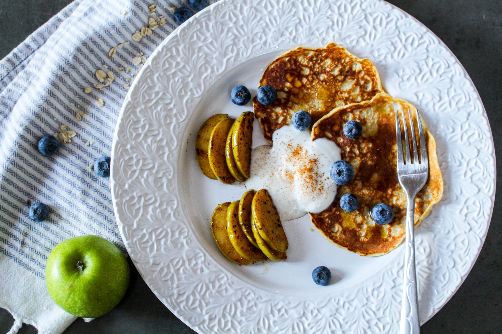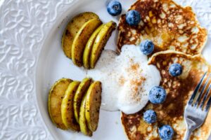 Havrepannkakor med vaniljyoghurt, färska blåbär, lönnsirap och stekta äpplen.