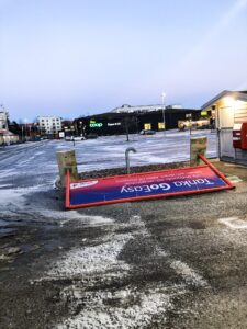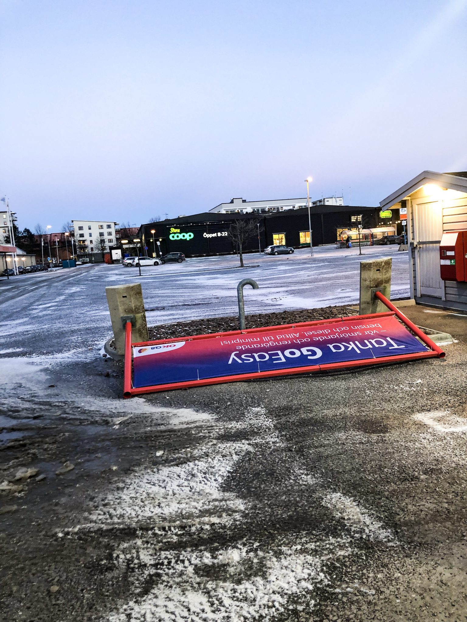 I morse kunde inte mammahjärtat släppa iväg Mellan till jobbet med sin lilla bil så jag erbjöd honom skjuts. Vi stannade för att tanka och såg att en sån här skylt vält.