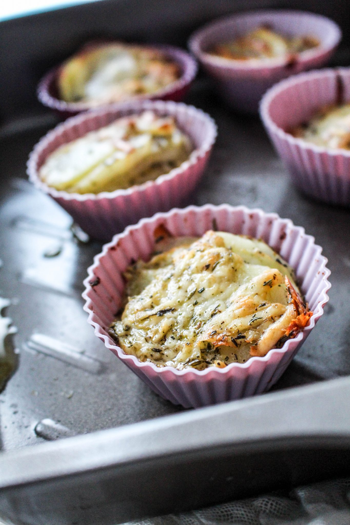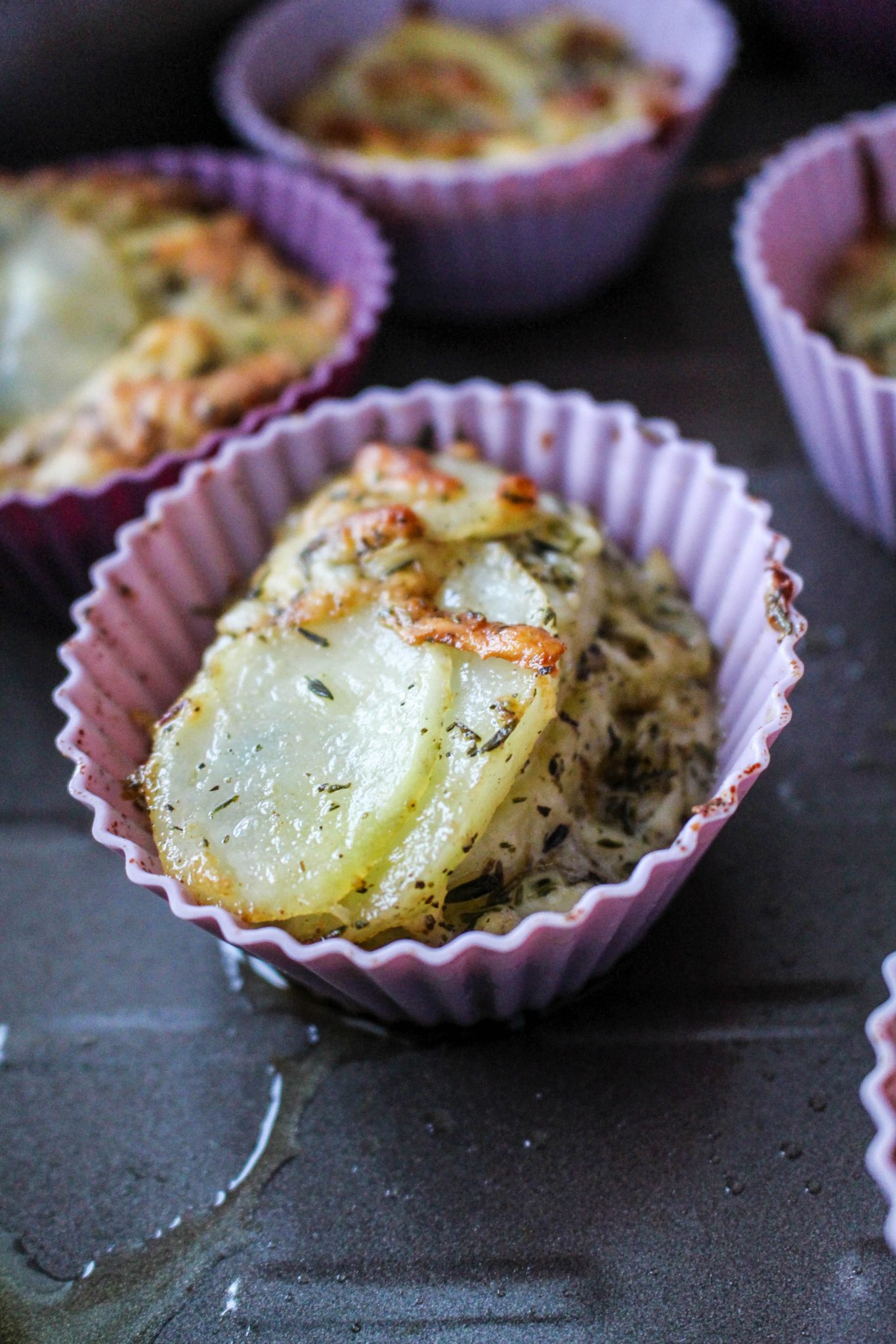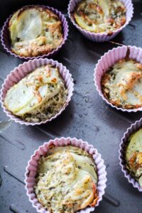 4) Ta fram en muffinsplåt eller som jag har här, silikonformar. Fördela potatisröran i varje form. Jag la dem lite på varandra så det får plats mycket i varje form. Grädda i ugnen på 180 grader i ca 30 min!