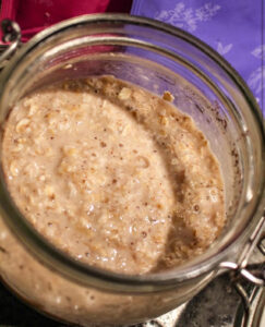 1) Blanda havregryn, vatten, salt, kardemumma, salt, kanel, mosad banan och lönnsirap i en glasburk eller liknande. Det är bra om du kan sätta lock på det i kylen. Ställ i kylen i minst 2 timmar, gärna hela natten.