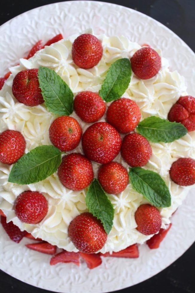 5) Fyll tårtan med vaniljkräm. Spackla sedan tårtan med grädde. Spritsa lite fina mönster uppepå och toppa med några jordgubbar och mynta. Somrigt och sååå gott!