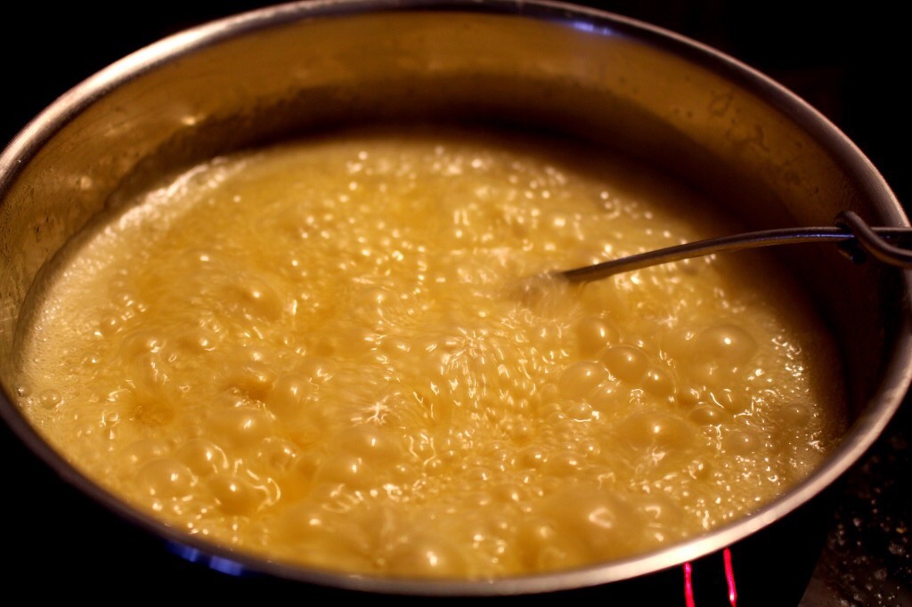 2) Koka upp grädde, socker, sirap och smör. Låt koka under omrörning ca 5-7 min.
