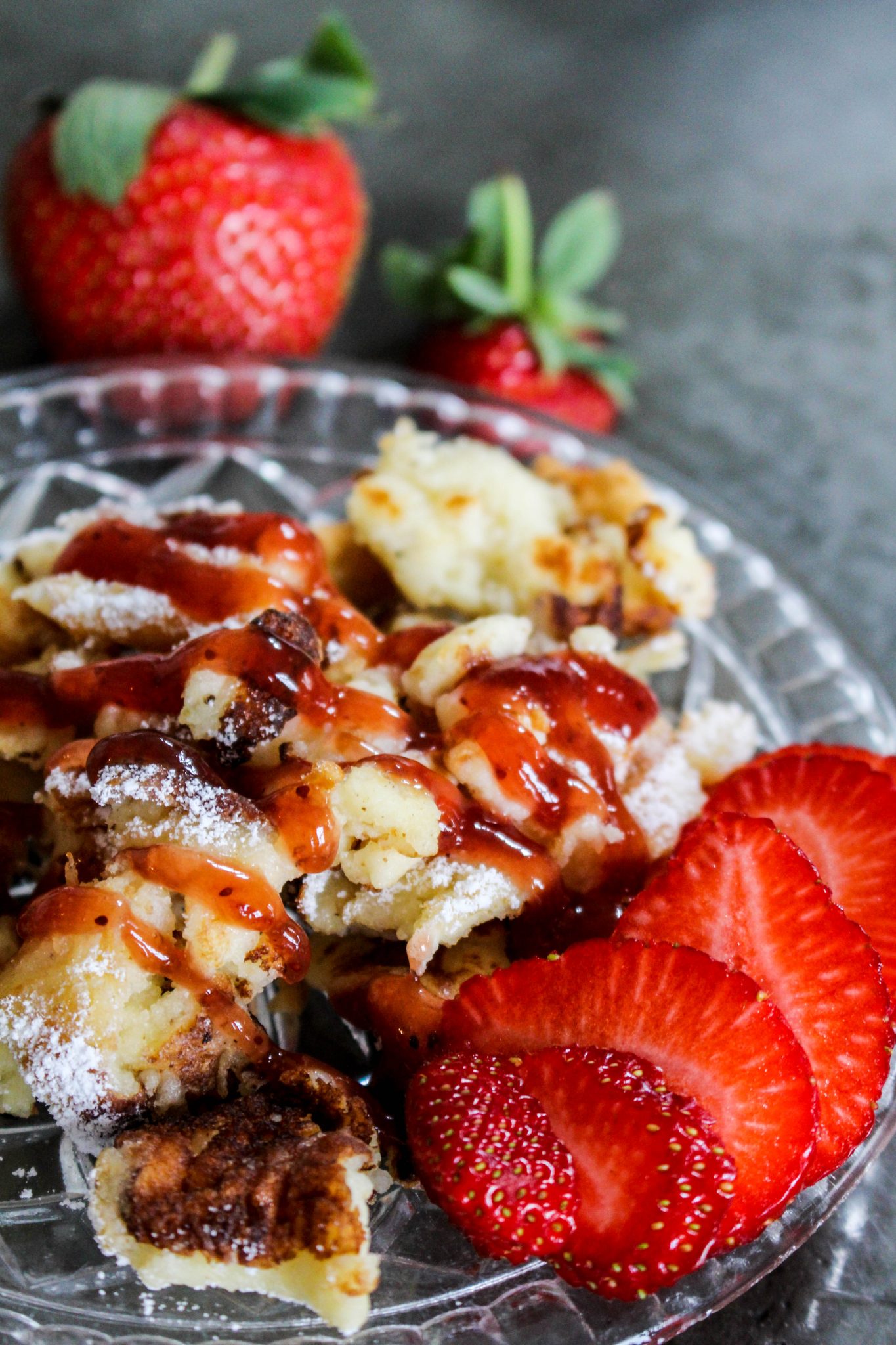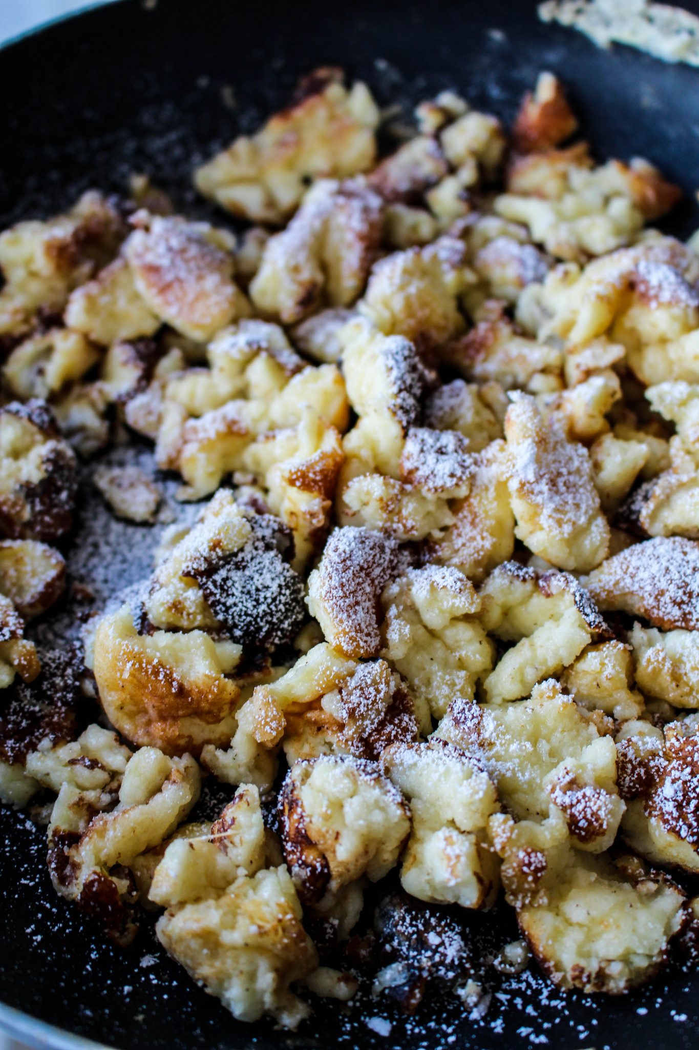 3) Vänd den stora pannkakan och stek på andra sidan tills den är genomgräddad. När den är genomgräddad så drar du isär pannkakan till små bitar – ca 2-3 cm stora. Jag använde två trägafflar. Häll i lite mer smör och grädda den någon minut till.