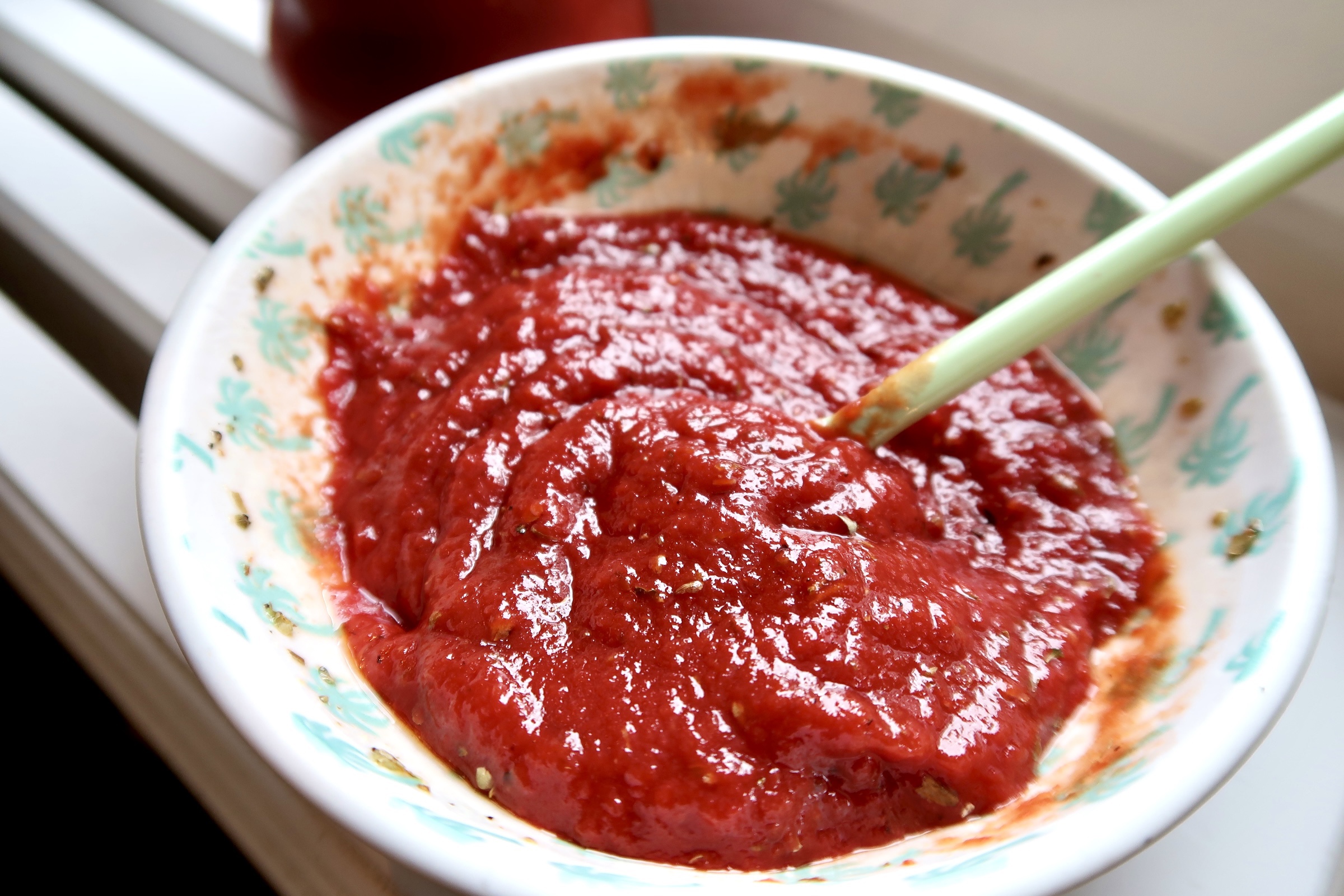 4) Blanda tomatpuré med olivolja, chilisås, salt och peppar. Bred sedan ut tomatsåsen över ugnspannkakan.