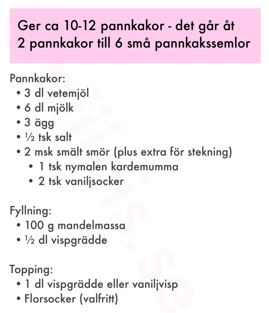 Semlor är en riktig favorit under våren, men har du testat att göra pannkakssemlor? Det är precis lika gott som det låter – tunna, frasiga pannkakor fyllda med ljuvlig mandelmassa och fluffig grädde uppepå, eller varför inte vaniljvisp som jag använde. Perfekt när du vill ha en snabbare variant av den klassiska semlan, utan att baka bullar. Den här varianten är enklare än vanliga semlor, men minst lika god! Med perfekta svenska pannkakor som bas får du en lyxig dessert eller ett festligt fika som garanterat blir en succé. Den gjorde i alla fall total succé här hemma hos tonåringen som är sjuk.