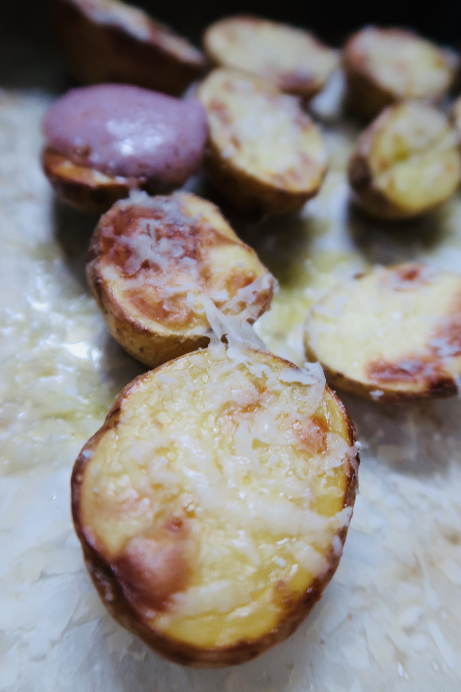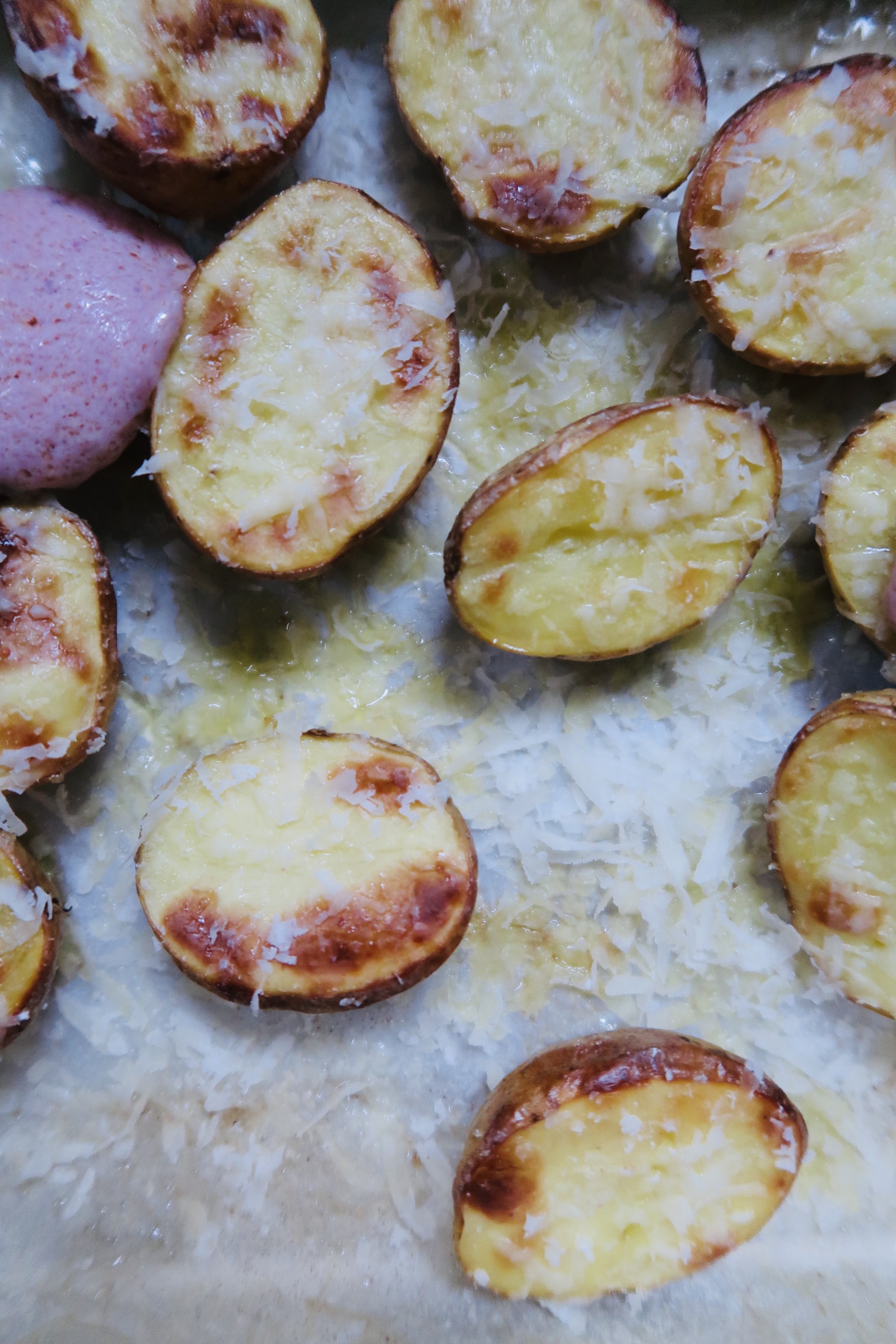 1) Tvätta potatisen ordentligt. Dela den på mitten. Lägg på bakplåtspapper i en ugnsfast form. Ha på olivolja och salt. Skjuts in i mitten av ugnen på 225 grader i ca 30 min. Ha på riven parmesan så fort du tar ut potatisen.