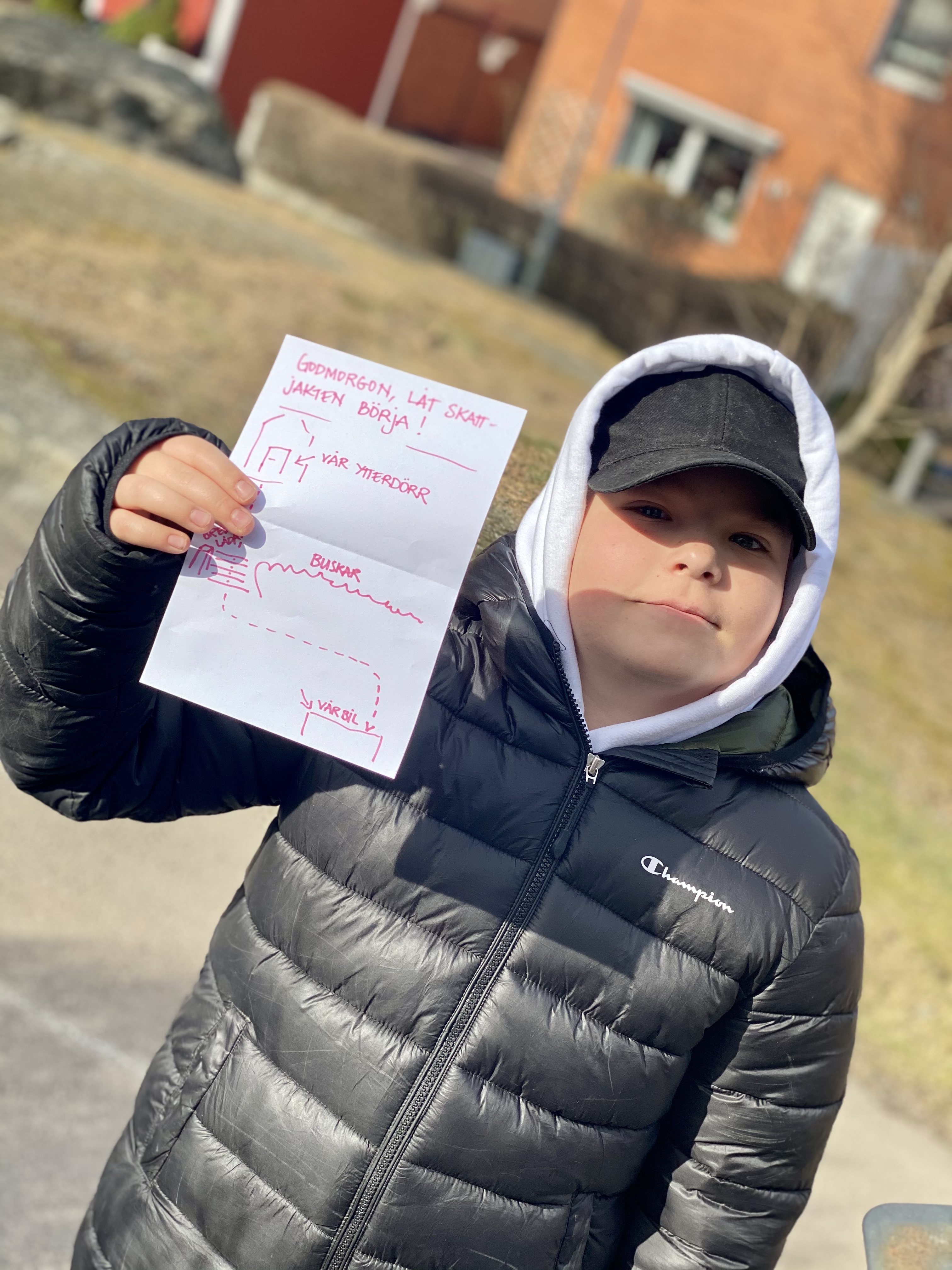 Traditionsenligt så var det ändå påskäggsjakt igår. Igår när vi filmade det hela så sa vi att det nog är vi föräldrar som numera tycker det är roligast, haha…. Men så länge han ändå vill leta efter sina ägg så görs en skattkarta såklart. Jag tror att de stora barnen också ska få en varsin skattkarta när dom kommer ikväll. Haha! Älskar den traditionen.