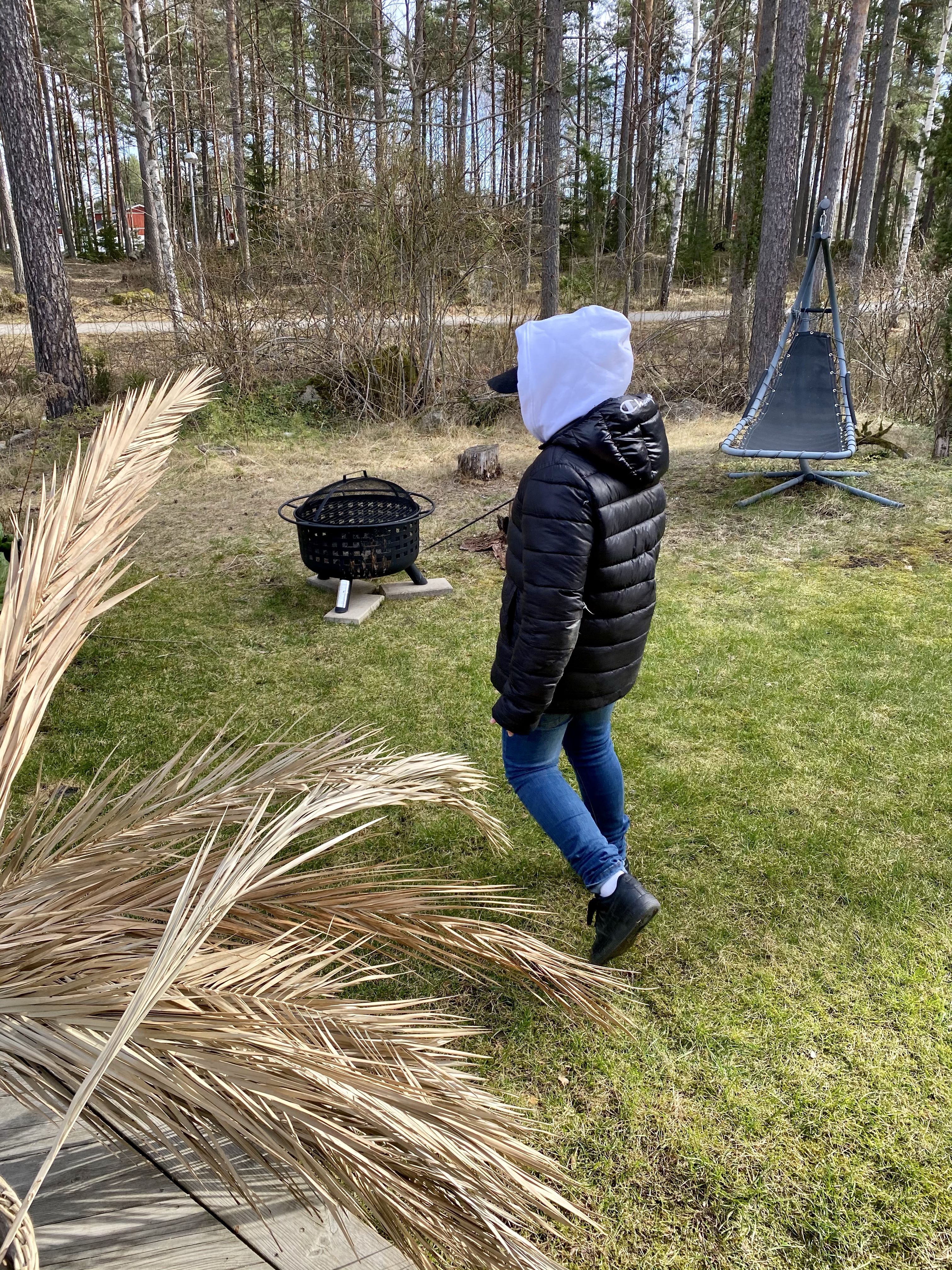 På vår baksida började sedan det riktiga letandet. Han tyckte dock det var lite konstigt att han behövde ge sig ut på den långa promenaden för att sedan ändå leta på baksidan av vårt hus. 😅 Tony hade gömt ägget under massa kvistar och grejer. Det var ett rejält ägg att gömma dessutom. 😅