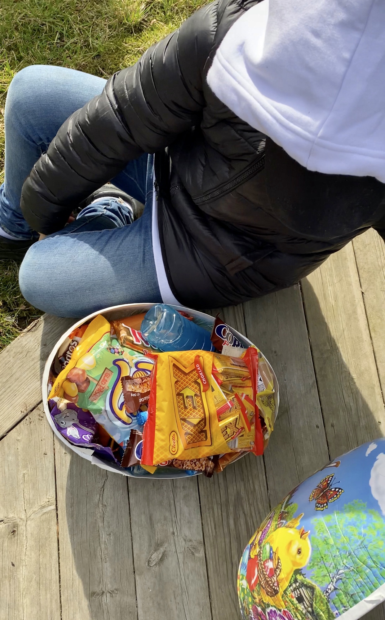 Favoritsnacks, favoritgodis, en slant och massa dricka fick plats i det. Ett tips är att spara påskäggen, det gör vi. Ett sånt här stort ägg kostar ju liksom 200 kr att köpa. Jätteonödigt att köpa nytt varje år ju.