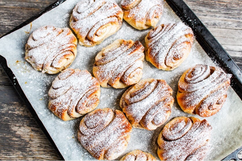 2) Häll i strösocker och salt. Häll också i en del av mjölet. Blanda i det mjuka smöret och lite av mjölet i taget tills du har en smidig deg som släpper kanterna i bunken.