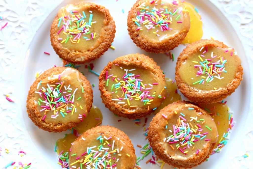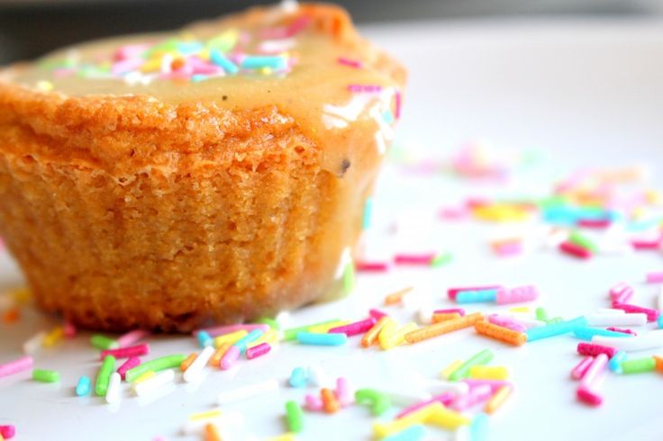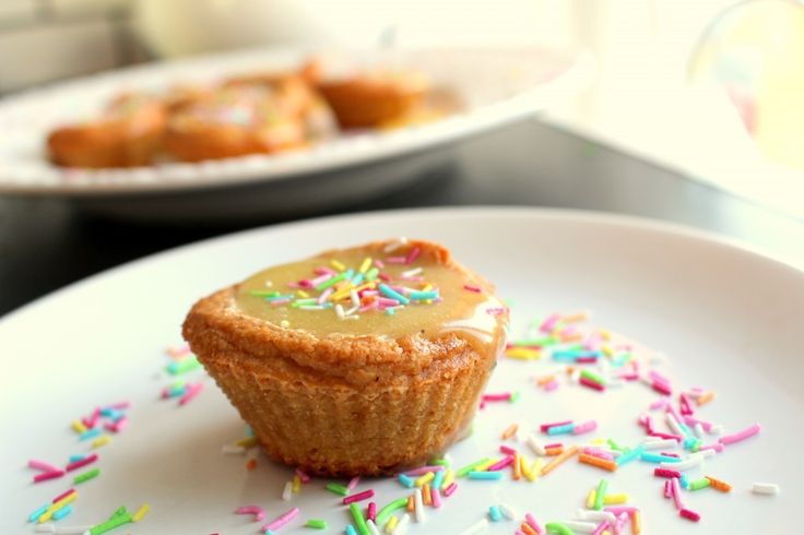 4. Dags för glasyren. Smält smöret, ta av kastrullen från värmen. Ha i florsocker och vaniljsocker. Rör om. Ha i en äggula så binder det samman glasyren. Häll på glasyr på varje muffins. Det får gärna rinna lite på sidorna, det är bara göttigt med lite sånt. Låt glasyren stelna till lite. Ha till sist på lite strössel.