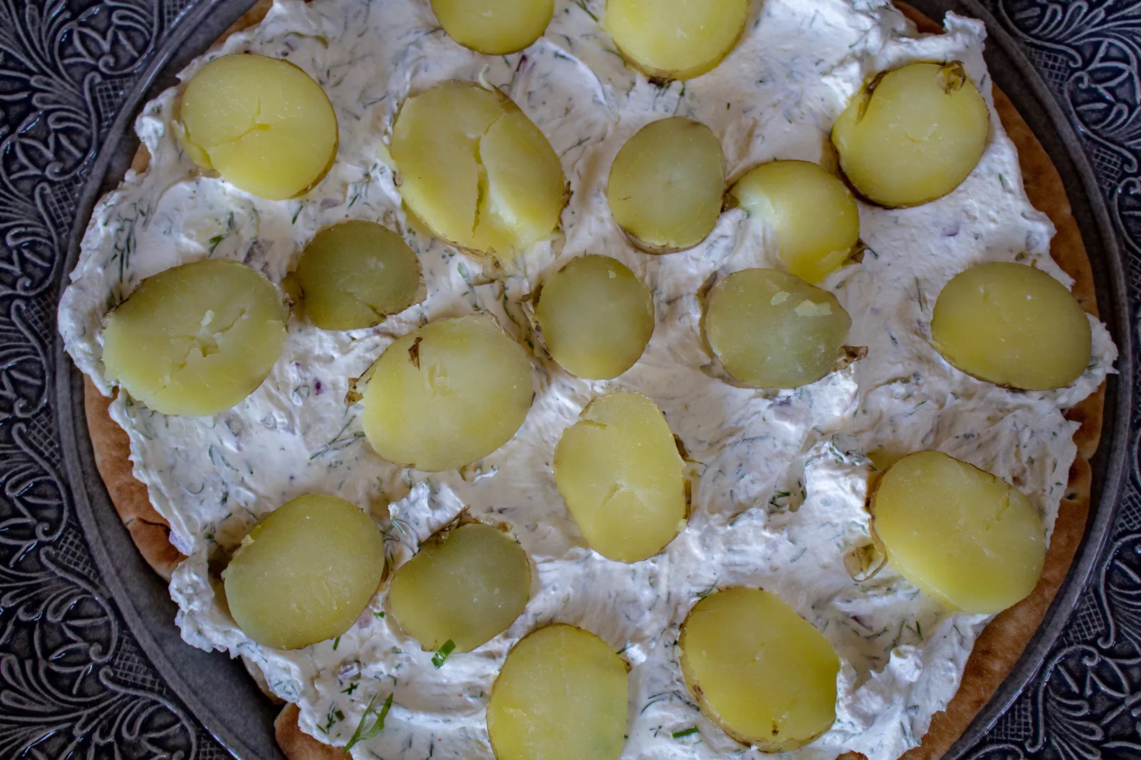 3) Lägg ut brödet på ett stort fat. Det ska vara ett stort runt bröd. Bred ut ungefär hälften av fyllningen på kakan. Skiva färskpotatis och lägg på, dela äggen i 4 klyftor och lägg på dem också. Rippla över lite räkor avslutningsvis.
