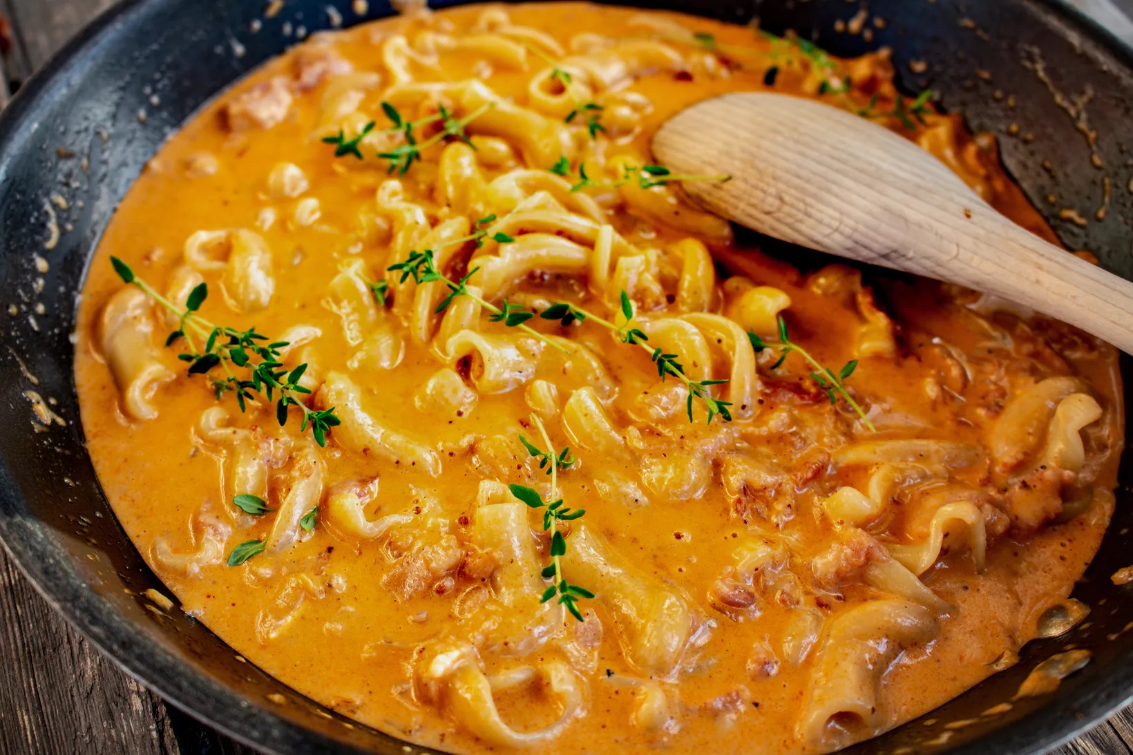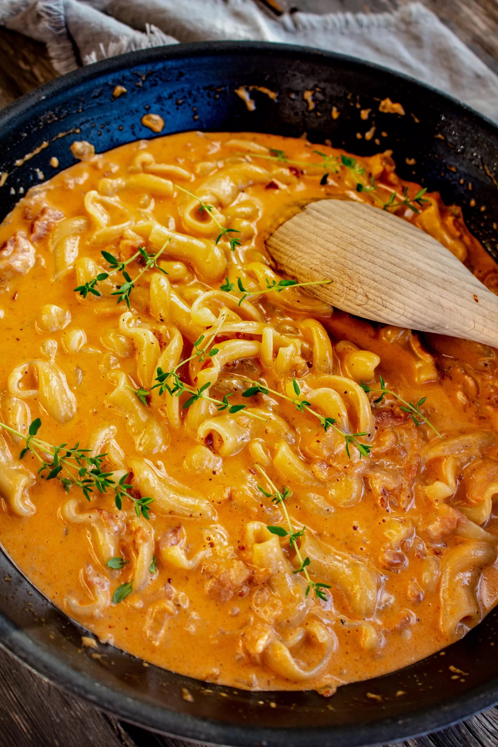 5) Koka pastan enligt anvisningarna och häll i den i pannan, rör om. Toppa med några stjälkar timjan eller någon annan ört du gillar. Servera genast!