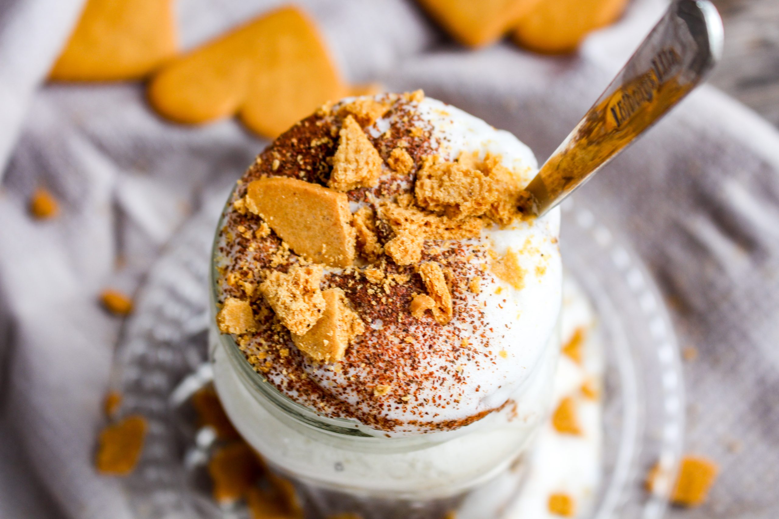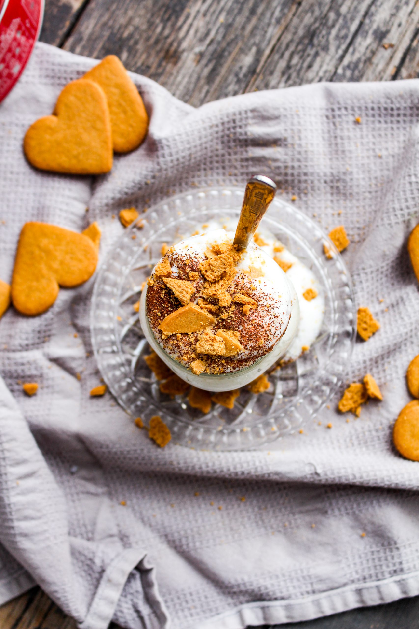 4) Toppa med pepparkakskrydda eller kanel och smulade pepparkakor.