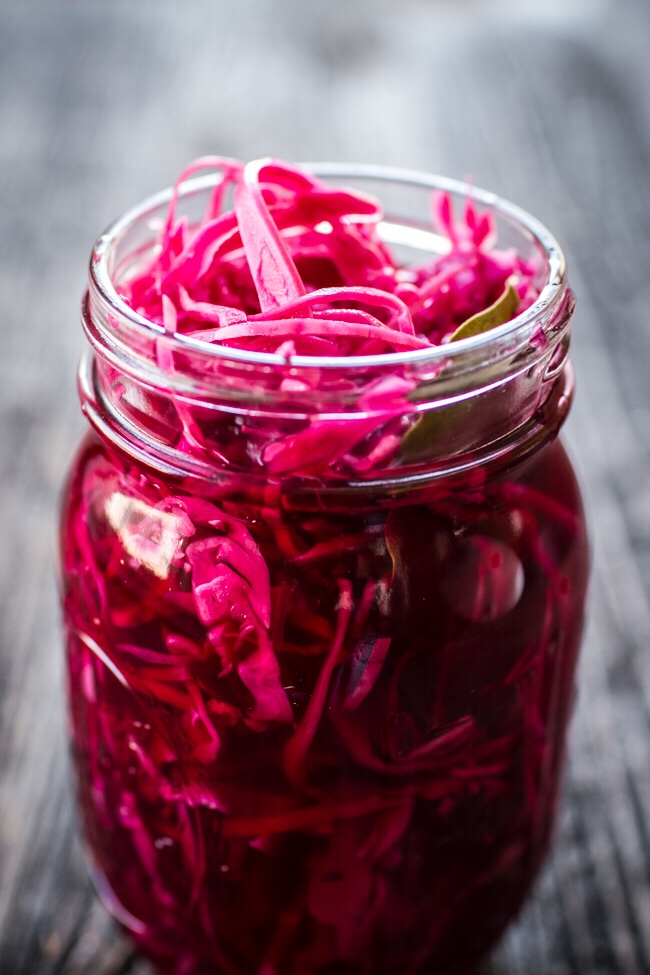 4) Häll allt över rödkålen i burken. Vätskan kommer inte täcka allt helt till en början, men kålen kommer mjukna varefter och krympa ihop så vätskan täcker. Låt stå minst 4 timmar men gärna över natten. Håller i 2 veckor med tätslutande lock.