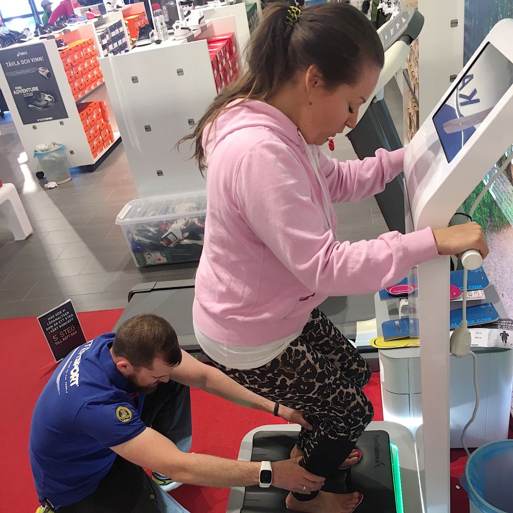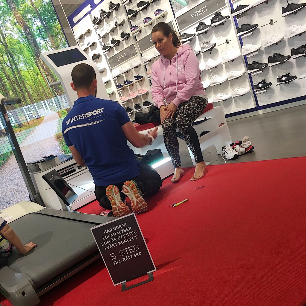 Han förklarade allt runtomkring och vad som kan vara viktigt att tänka på. Som stöd, svikt, dämpning osv. Här på bilden sitter jag och ska just få formgjutna sulor. Han berättade om en kvinna som haft så mycket problem med nacken men som fick bort det helt med formgjutna sulor. En annan hade stora bekymmer med benhinneinflammation, försvann på en vecka med sulorna. Jag har problem med knän, ryggen, nacke och axlar. Knäna trodde han helt klart berodde på skorna. Så det blev formgjutna sulor och ordentliga löparskor som ska ge bästa stödet för att stå hela dagarna. Sen funkar dom fint att promenera och jogga med också.