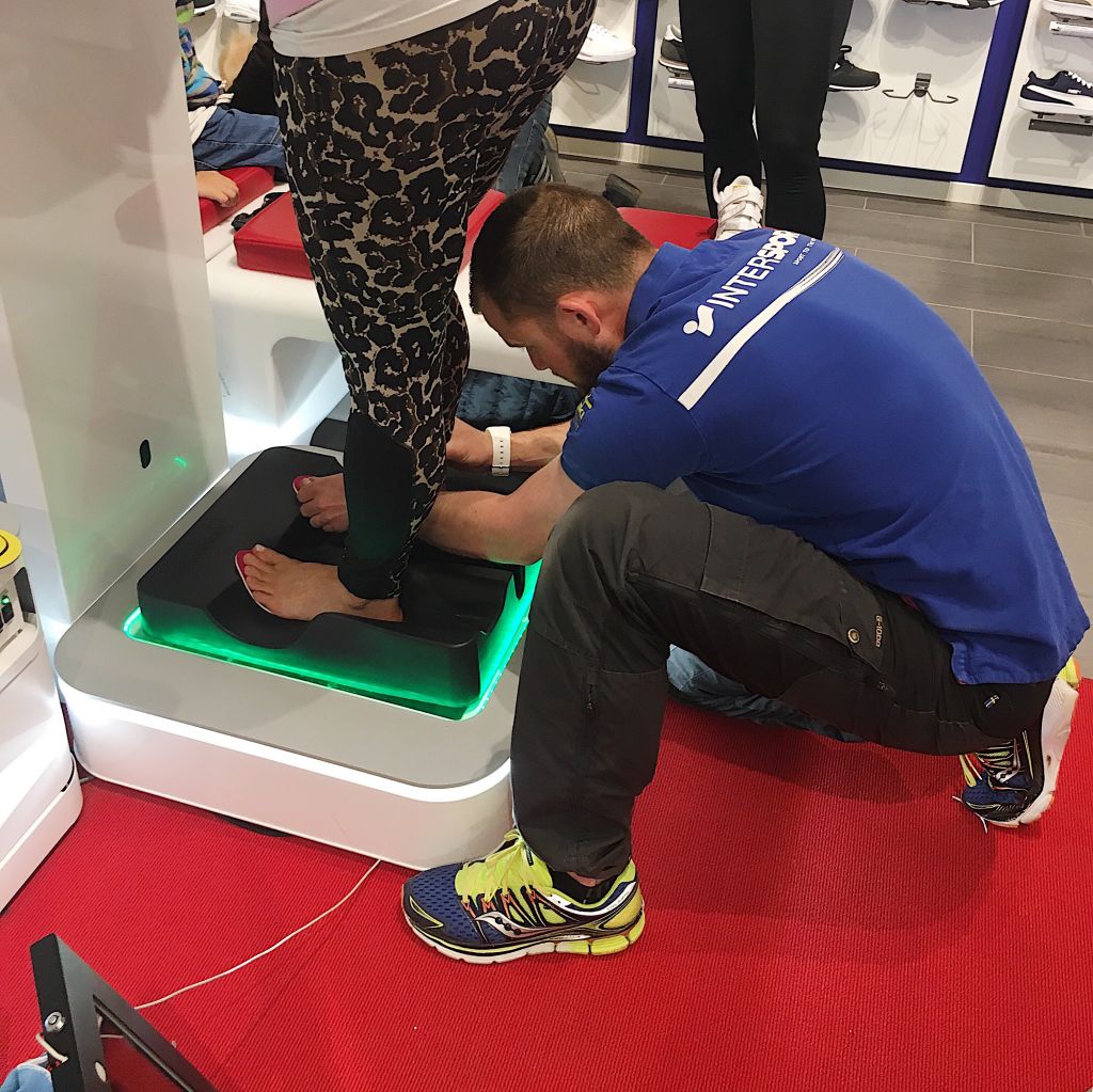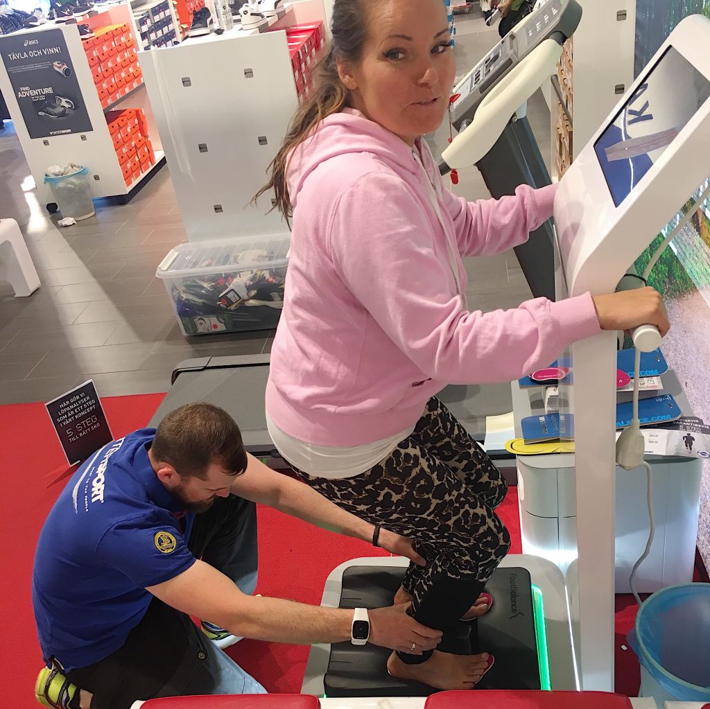 Han förklarade allt runtomkring och vad som kan vara viktigt att tänka på. Som stöd, svikt, dämpning osv. Här på bilden sitter jag och ska just få formgjutna sulor. Han berättade om en kvinna som haft så mycket problem med nacken men som fick bort det helt med formgjutna sulor. En annan hade stora bekymmer med benhinneinflammation, försvann på en vecka med sulorna. Jag har problem med knän, ryggen, nacke och axlar. Knäna trodde han helt klart berodde på skorna. Så det blev formgjutna sulor och ordentliga löparskor som ska ge bästa stödet för att stå hela dagarna. Sen funkar dom fint att promenera och jogga med också.