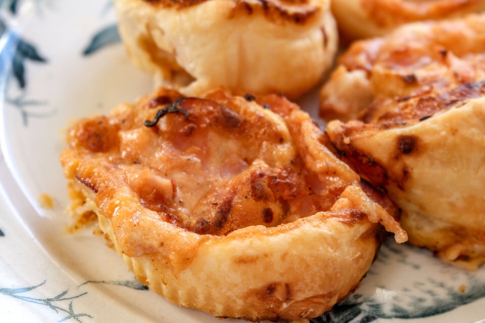 3) Skär i 2-3 cm breda bitar. Lägg i bakformar. Toppa med lite riven ost. Grädda på 200 grader i ca 15 min. De ska få fin färg, då är de klara.