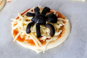 Lägg rundlarna på bakplåtpappersklädd ugnsplåt. Ha på tomatsås på varje.