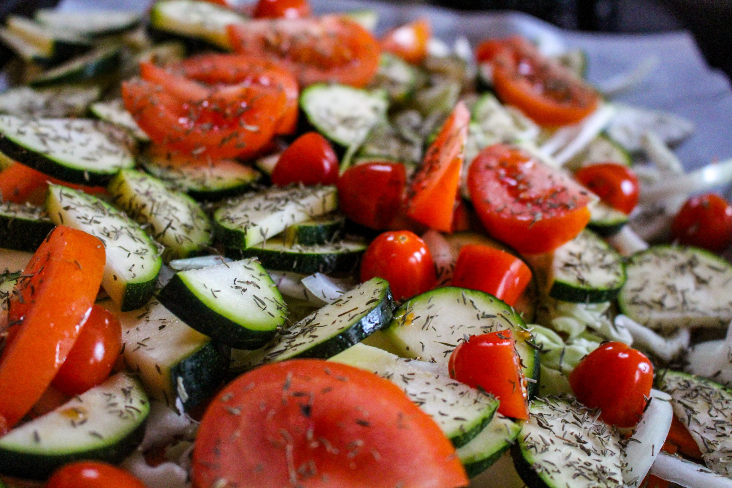 1) Skala och skiva upp morötter, löken och potatisarna. Tjoffa upp zucchini och tomater. Lägg allt på en bakplåtpappersklädd plåt. Häll över lite pumpafrön, havssalt, timjan och peppar.