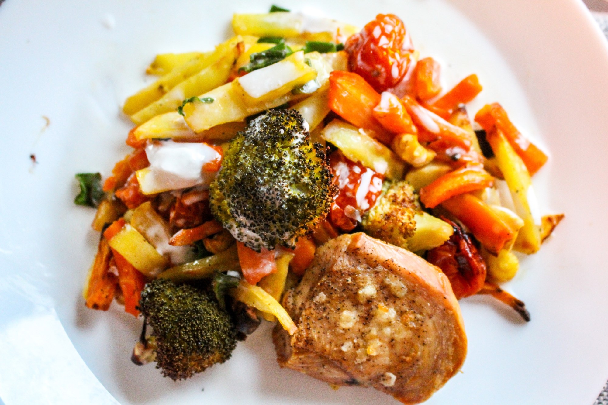 Kyckling med ugnsrostade grönsaker och kokosdressing.
