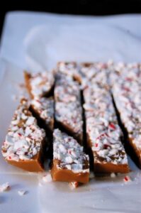 1) Klä en form, ca 10X20 cm, med bakplåtspapper så att det går upp litet på kanterna. Hacka polkagrisarna till kross. Antingen i en plastpåse och med botten av ett glas, eller i en blender.