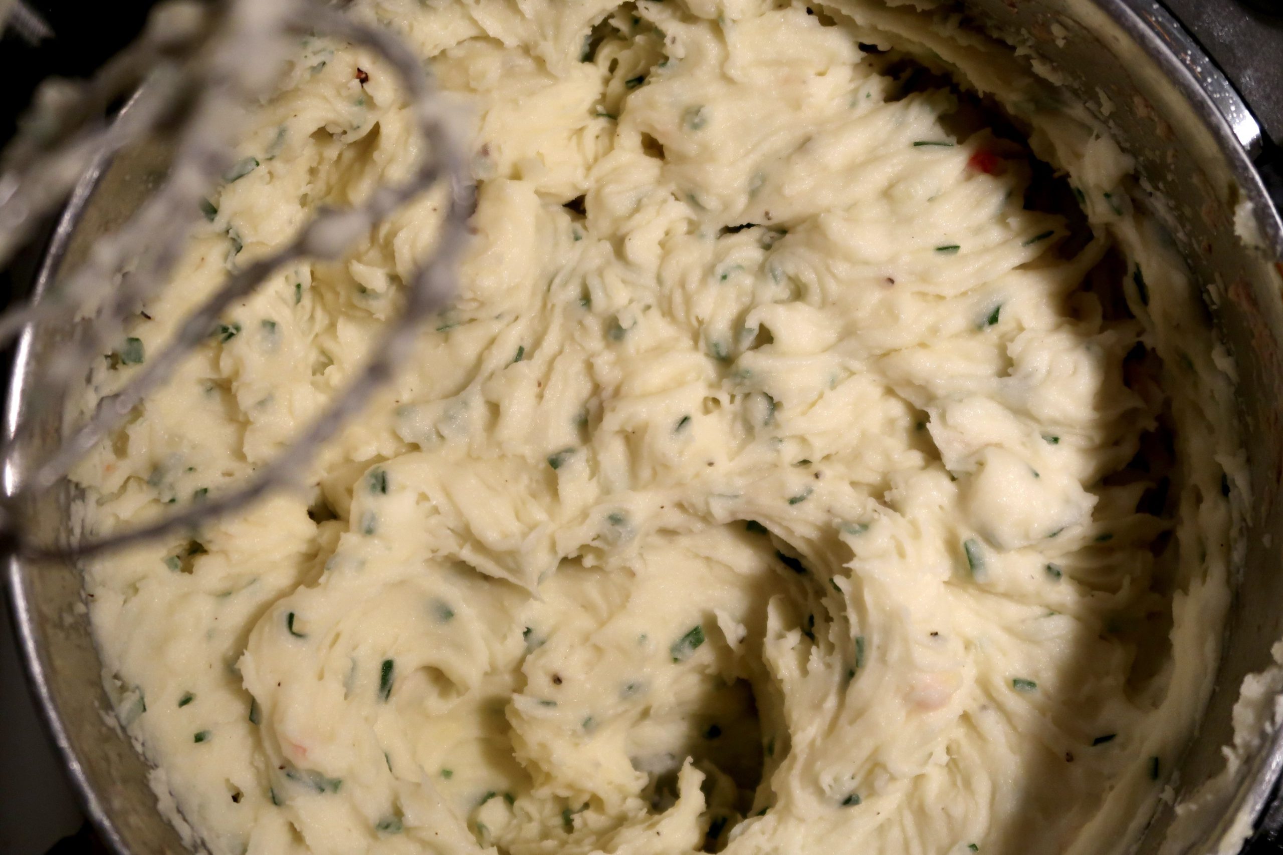 2) Potatistopping: Skala och koka potatisen. Häll av vattnet och stompa sönder potatisen. Ha i chili, gräslök, smör, äggula, mjölk, ost och salt & peppar. Vispa tills du har en krämig mos.