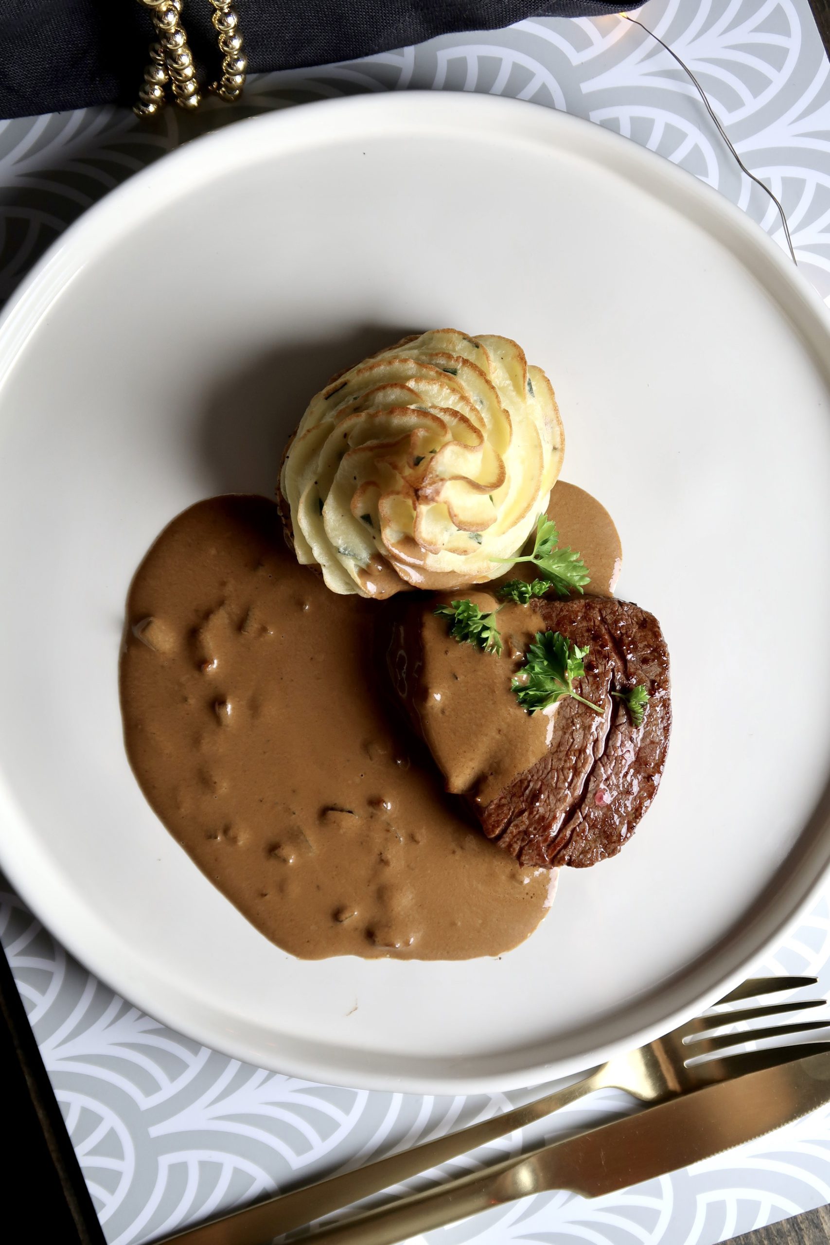 Maträtten ser väldigt god ut. Såsen vattnet hade jag hällt i pannan som man stekte köttet i och sen silat av använt till såsen.