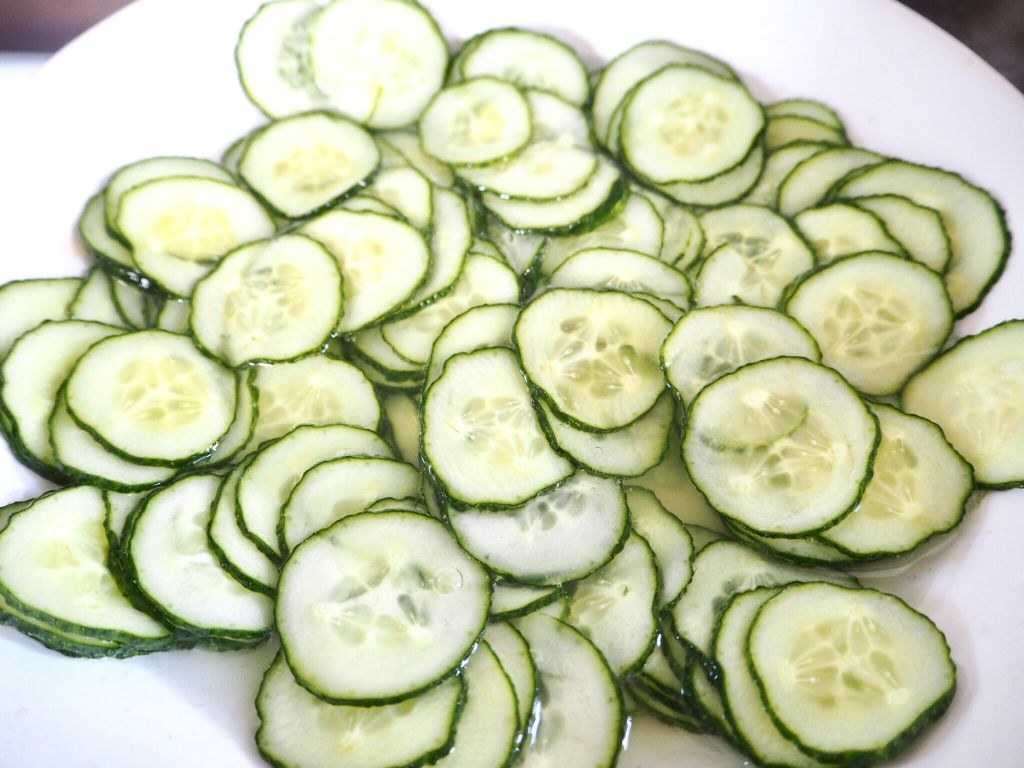 1) Börja med att skölja gurkan ordentligt. Skiva sedan gurkan med en osthyvel. Lägg den i en djup tallrik.