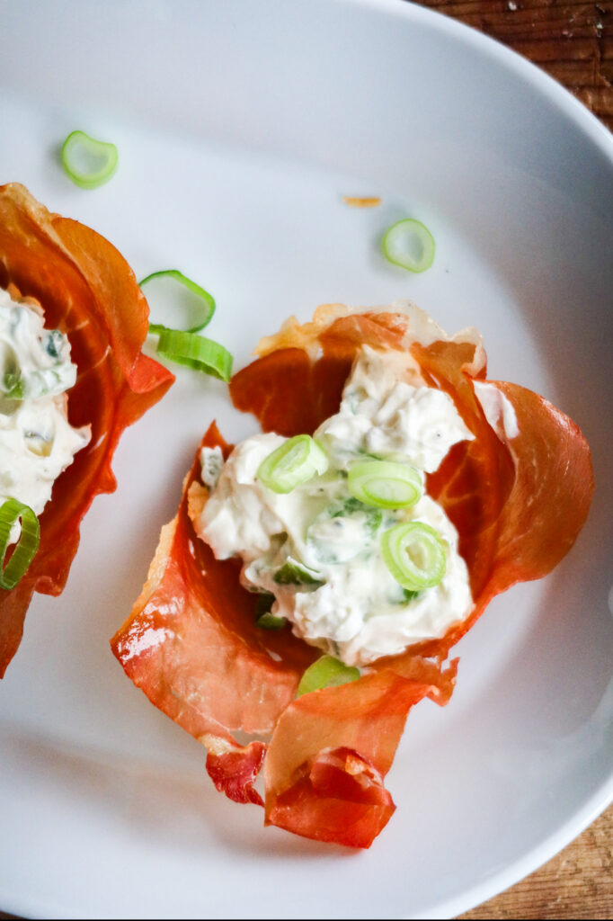 Dessa prosciuttokorgar blir sådär frasiga i kanterna, och fyllningen till passar så himla bra till det salta. Man äter dom som ”finger food” tänker jag, såklart kan man använda bestick också men man tar dem i typ två tuggor. Frågar man mannen så var det riktigt riktigt gott, han tog 3 på en gång, haha!