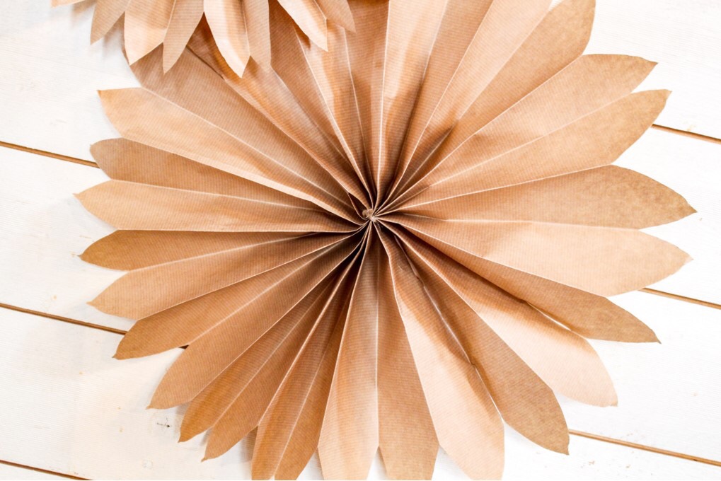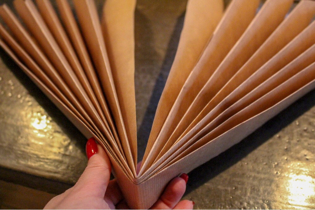 Dra sedan ihop den till en stjärna, tejpa, limma eller häfta så det blir till en stjärna.
