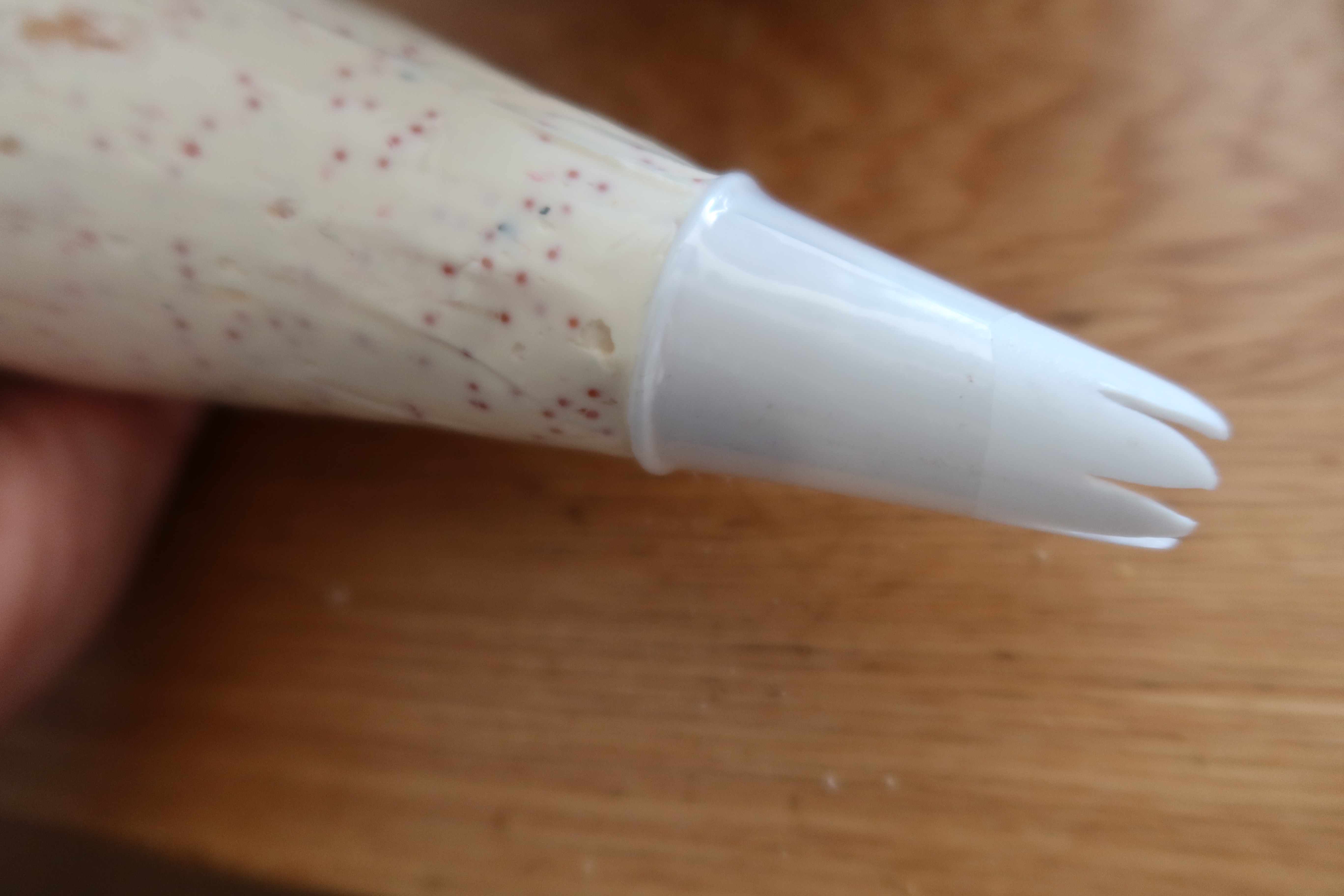 6) Topping: Vispa grädden och ha i stenbitsrom. Blanda runt ordentligt. Ha i det i en spritspåse och sprita över bakelsen. Du kan också bara klicka på det utan att använda spritspåse.