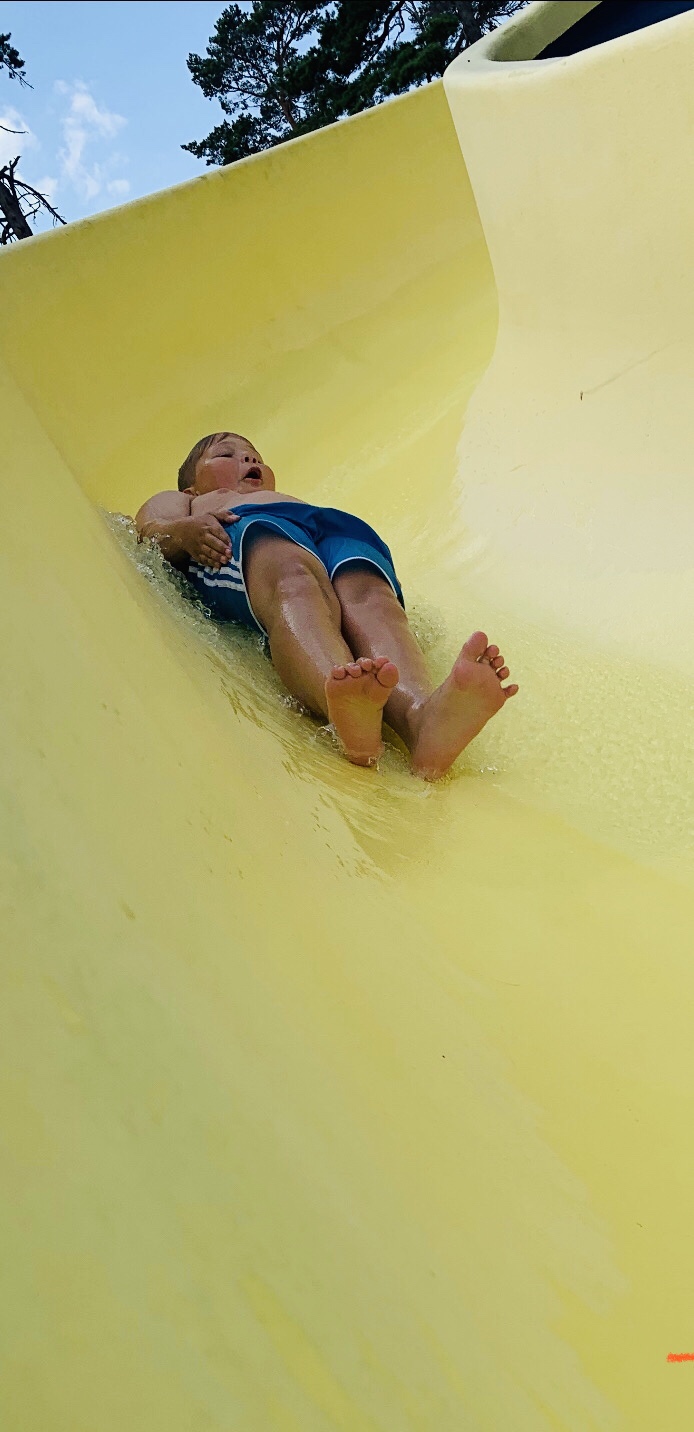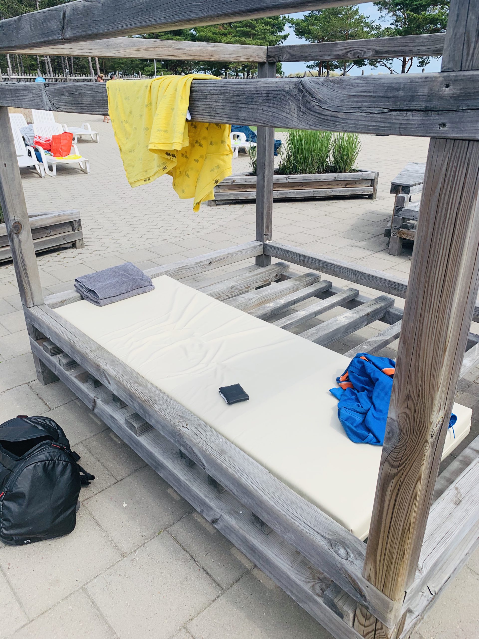 Igår körde jag en ”jobbdag” hemma i husvagnen och Tony och Milo gjorde vattenlandet. Där är det hårda restriktioner, det får t ex inte vara så många inne utan vattenlandet blir fullt rätt snabbt. Man blir tilldelad en solplats och den ska man sedan hålla till vid. Poolerna är extra klorade vilket är virusets värsta fiende. De här sängarna spritades dessutom innan Tony och Milo fick tillgång till dom, så bra!