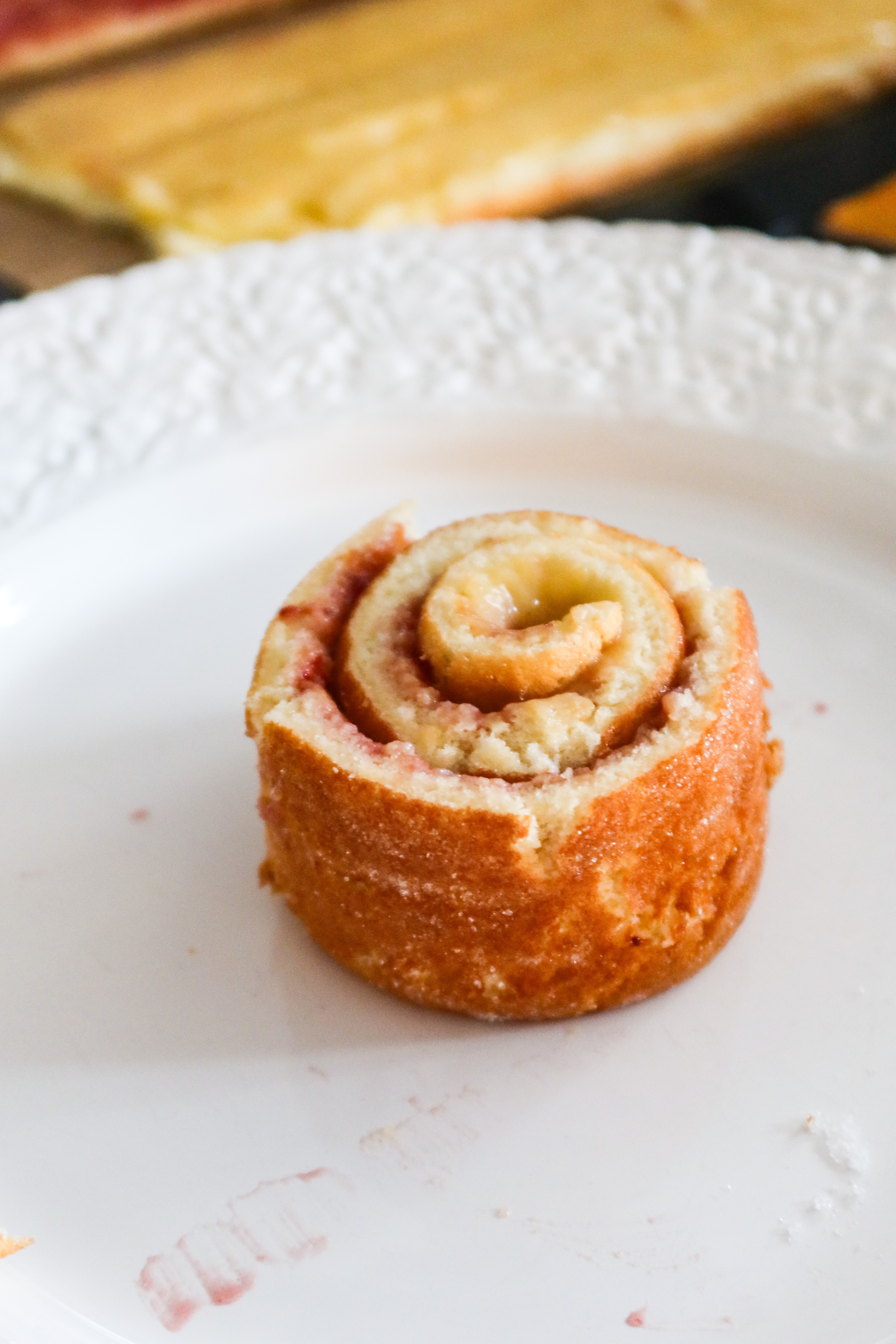 7) Ta sedan remsorna och rulla ihop den bit för bit. Jag tog varannan med jordgubbssylt och varannan med vaniljkräm.