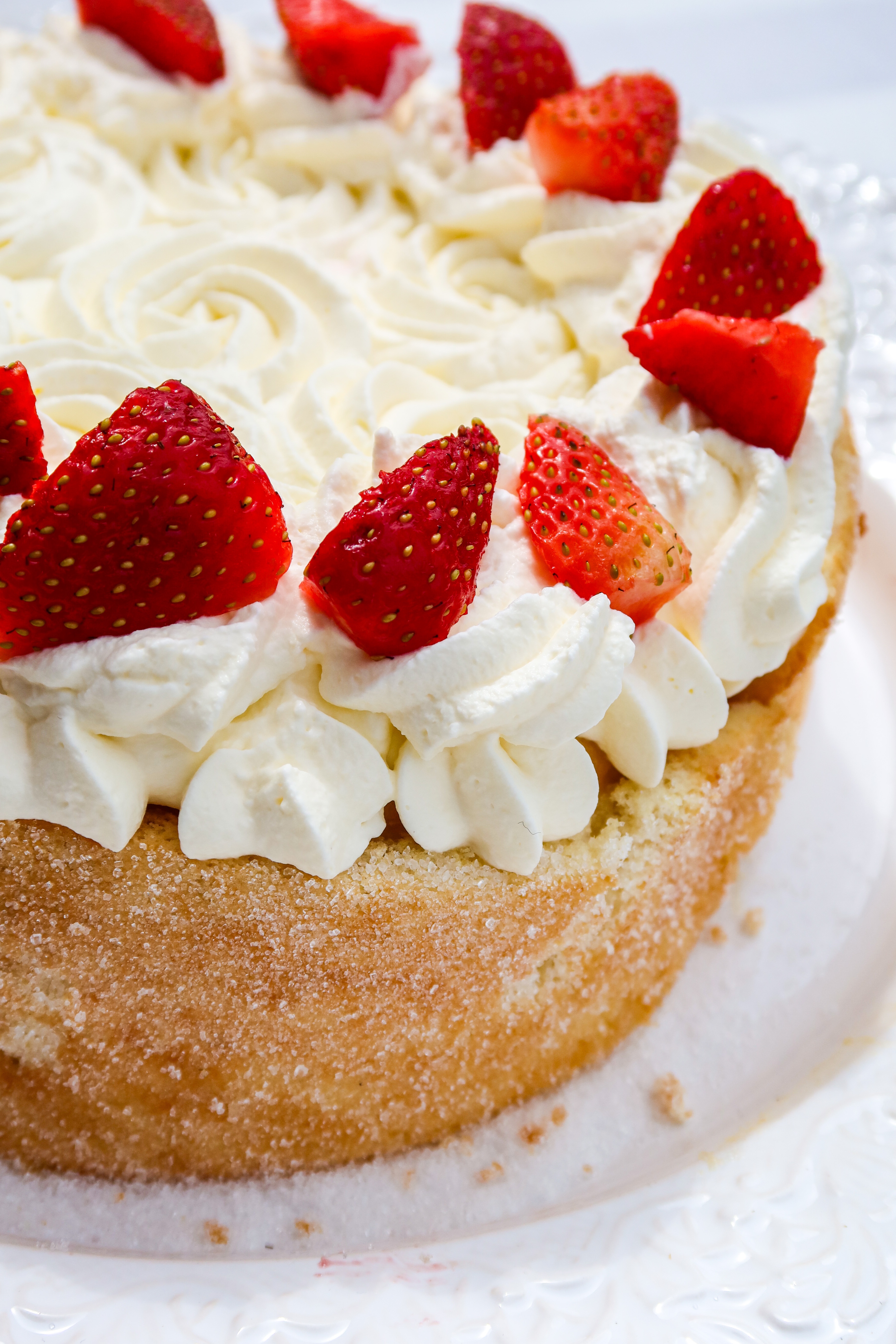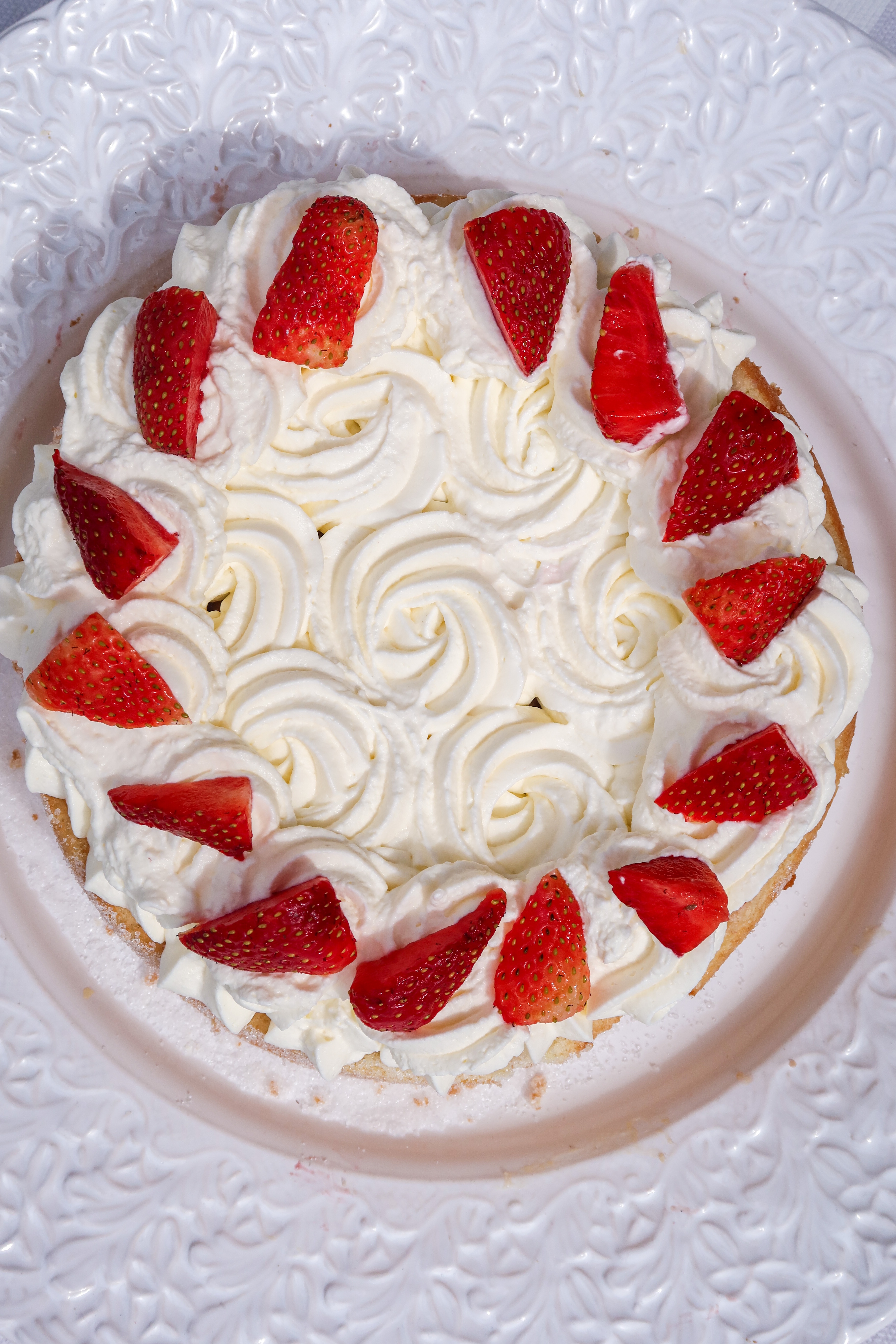 8) Vispa grädden och toppa med den, skär några jordgubbar och lägg på. Servera.