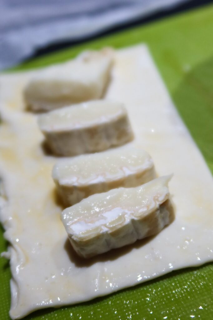1) Dela smördegen i 6 delar. Skär upp chevreost i bitar och lägg på plattorna.