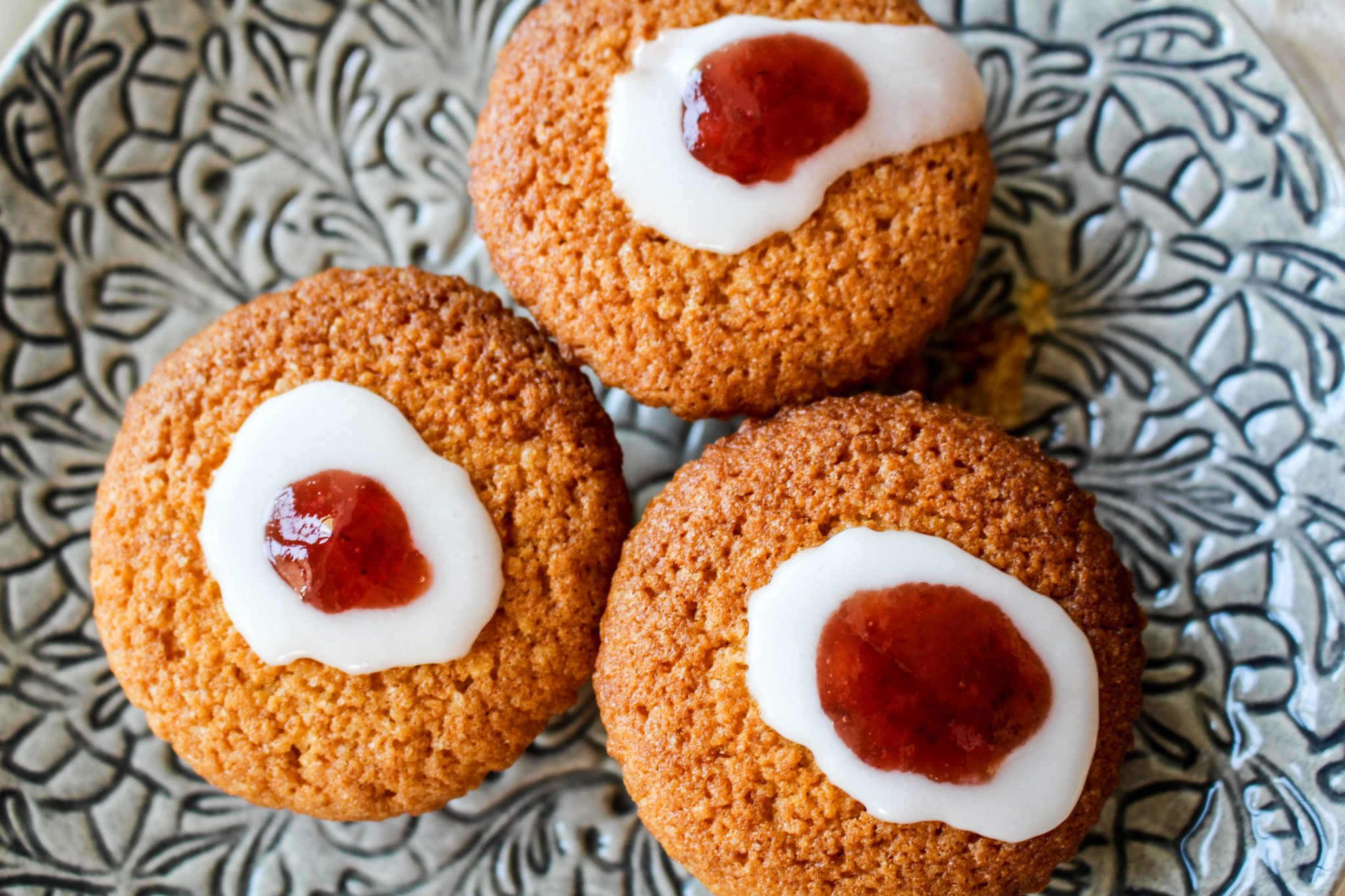 5) Garnering: Blanda florsocker, citron och vatten till en glasyr. Klicka sedan ut glasyren uppepå toppen och sedan en klick jordgubbssylt. Servera gärna dessa kakor med en klick vispad grädde. MUMS!