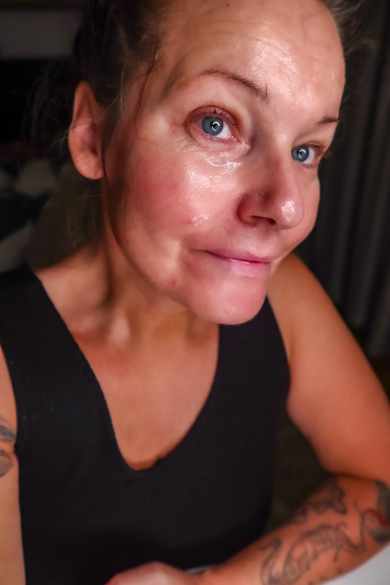 Här sitter jag och ser ut som en blöt katt! Har kladdat in håret i ansiktsmasken också. Haha, men jädrans så bra det blir alltså. Den här masken bara åker in slurp i ansiktet. Kan heller inte avgöra om det känns varmt eller kallt i ansiktet, supersjuk känsla men det känns verkligen som att den bara booooostar. ÄLSKAR!