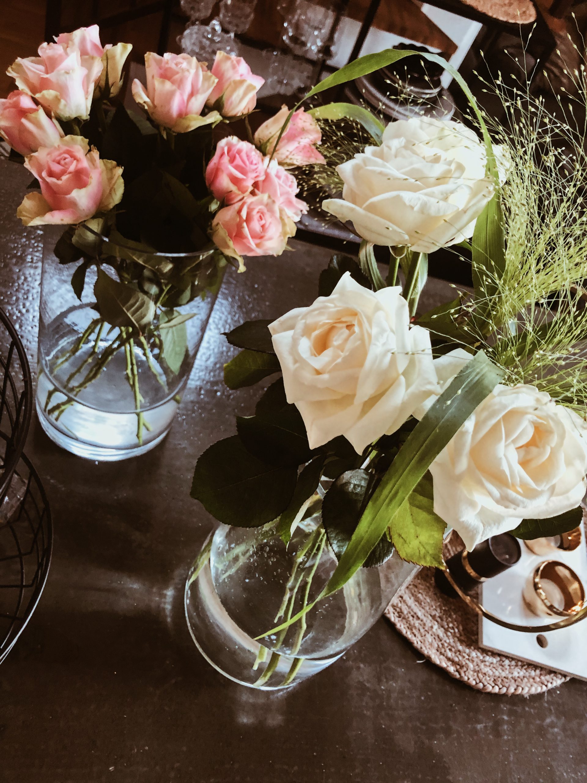 Bredvid står rosor som är köpta på Lidl. De hade stått ett par dagar när jag fick buketten med vita rosorna.