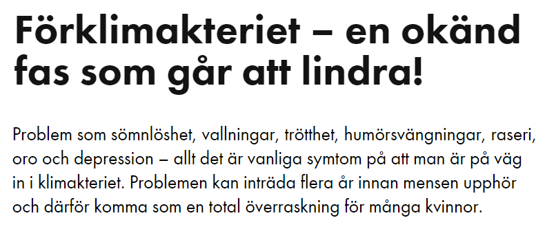 Perioden runt 40 år är för många kvinnor en mycket intensiv tid i livet – balanserande mellan yrkeskarriär och familjeliv, inte sällan med fortfarande ganska små barn. Att problem som sömnlöshet, irritation, oro och depression kan bero på att man är på väg in i övergångsåldern kan vara svårt att inse. Särskilt när man fortfarande får sin mens.
