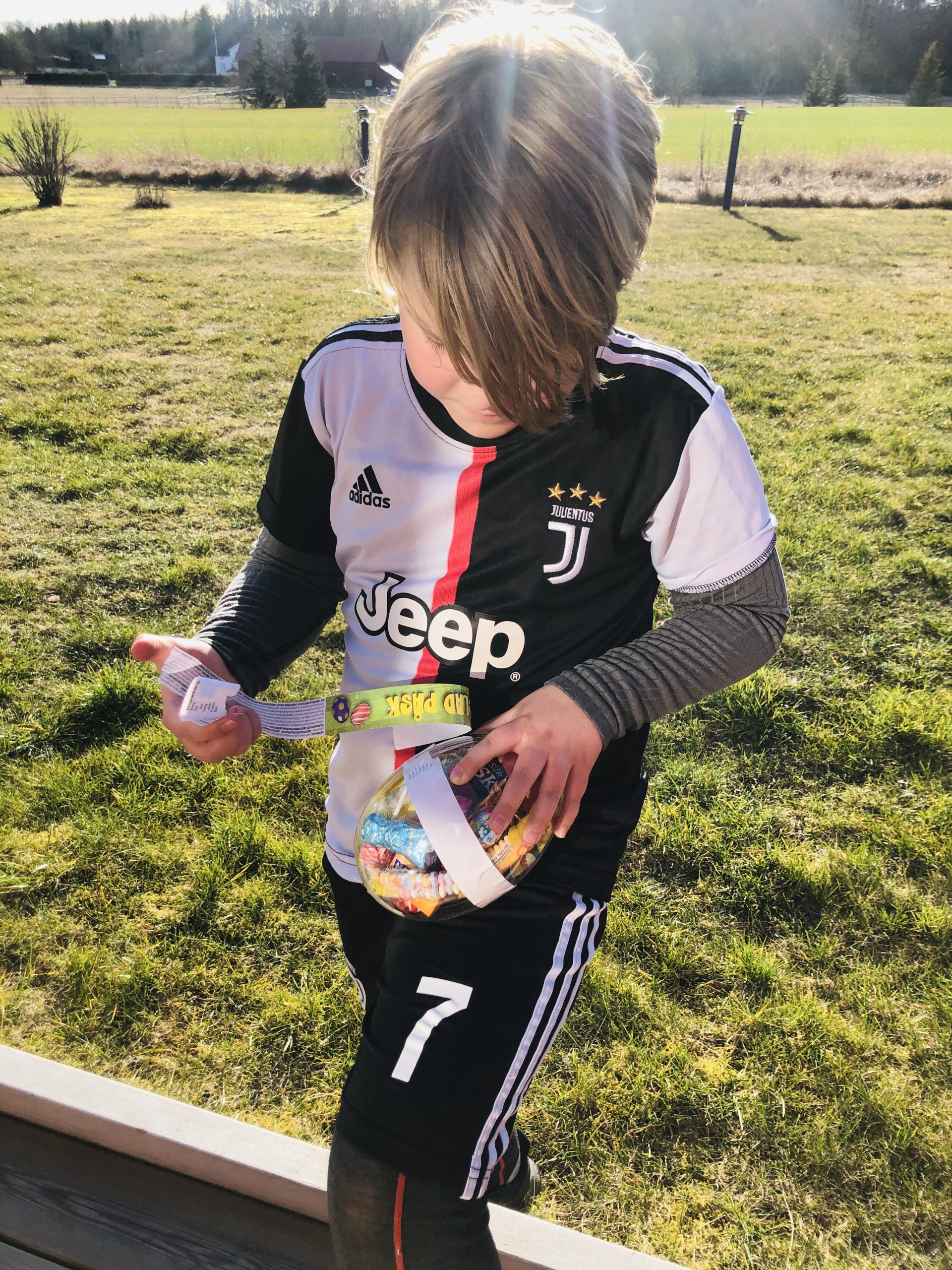Milo spelade fotboll och fick till sin stora glädje sitt påskägg av mormor och morfar. Inget han räknat med för här är vi stenhårda med att det är på påskafton som skattjakten är och man får leta påskägg. En tradition jag tänker hålla i så länge han tycker det är minsta kul.