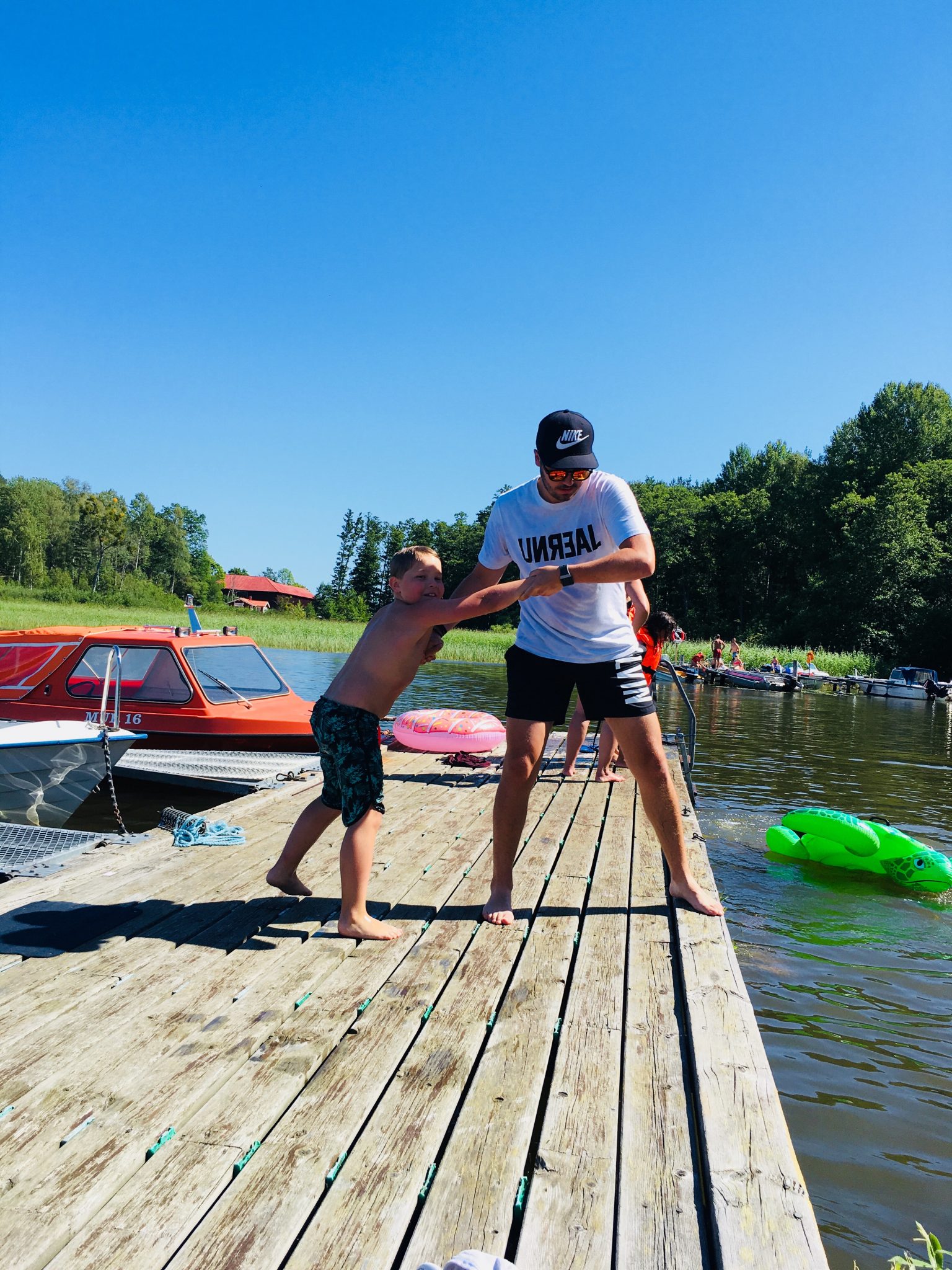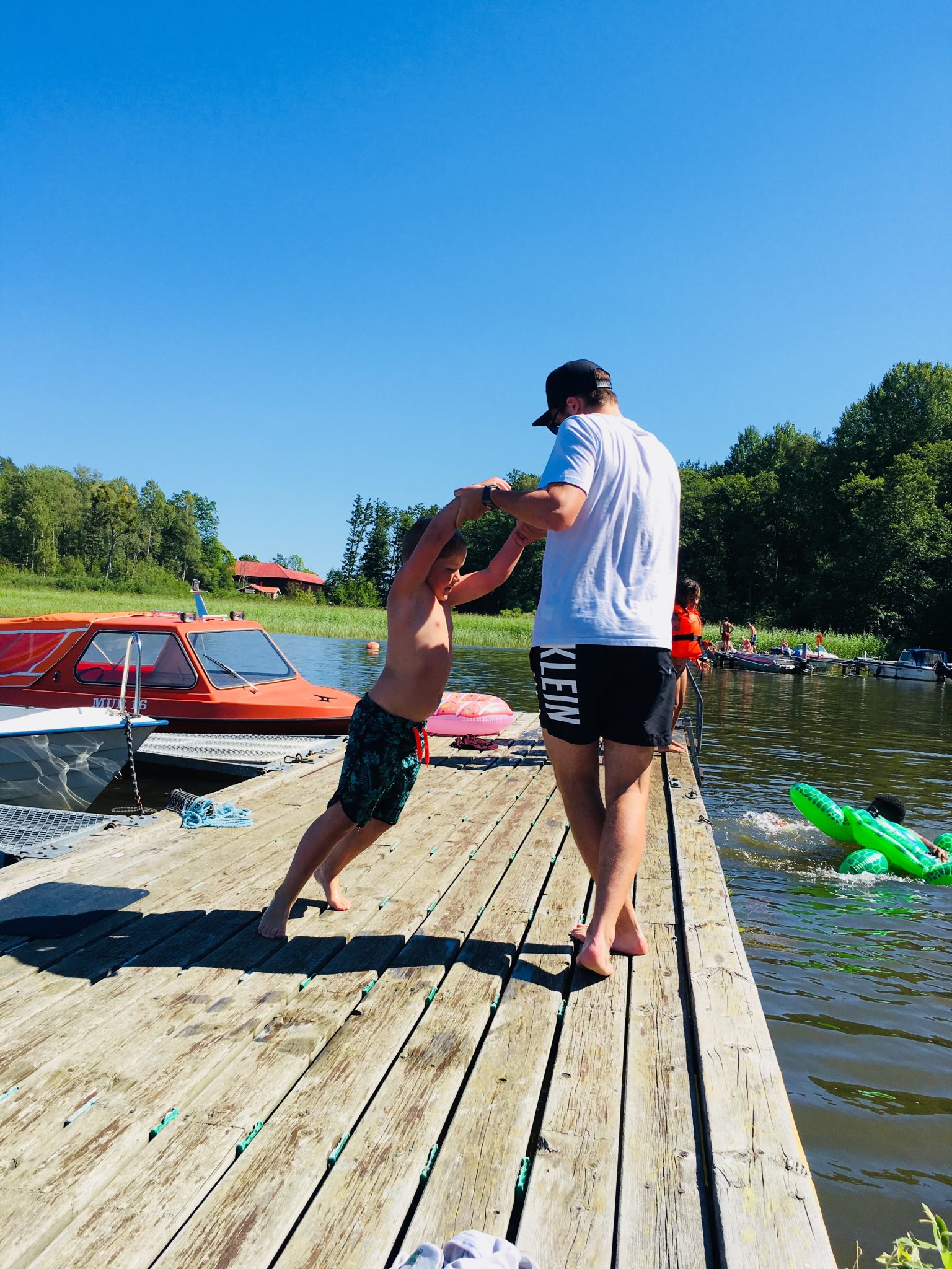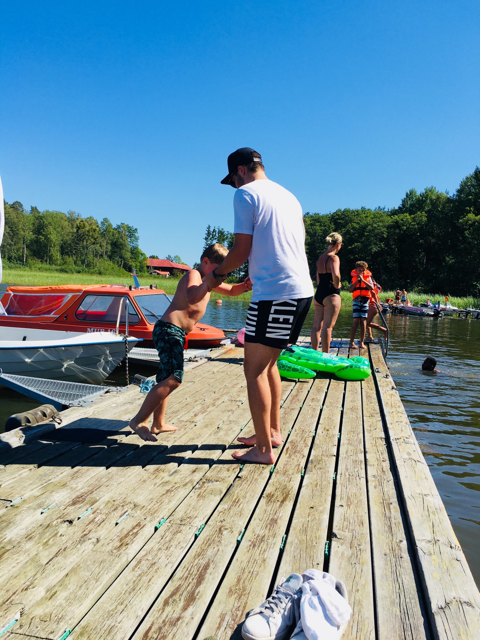 Efter vi ätit så gick vi ner till vattnet. Milo badade och jobbade hårt med att försöka få i äldsta brorsan. Det var nära några ggr men nä…. det var nästan så man hoppades lite. Thedde slängde i honom säkert 30 gg så det hade inte varit annat än rättvist.