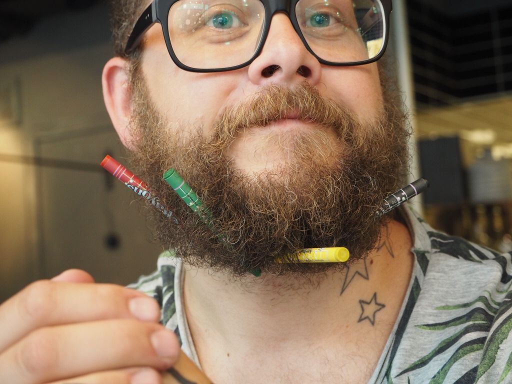 Skrattade gott åt Tonys stora skägg. Haha….han lyckades fästa 4 kritor i det.