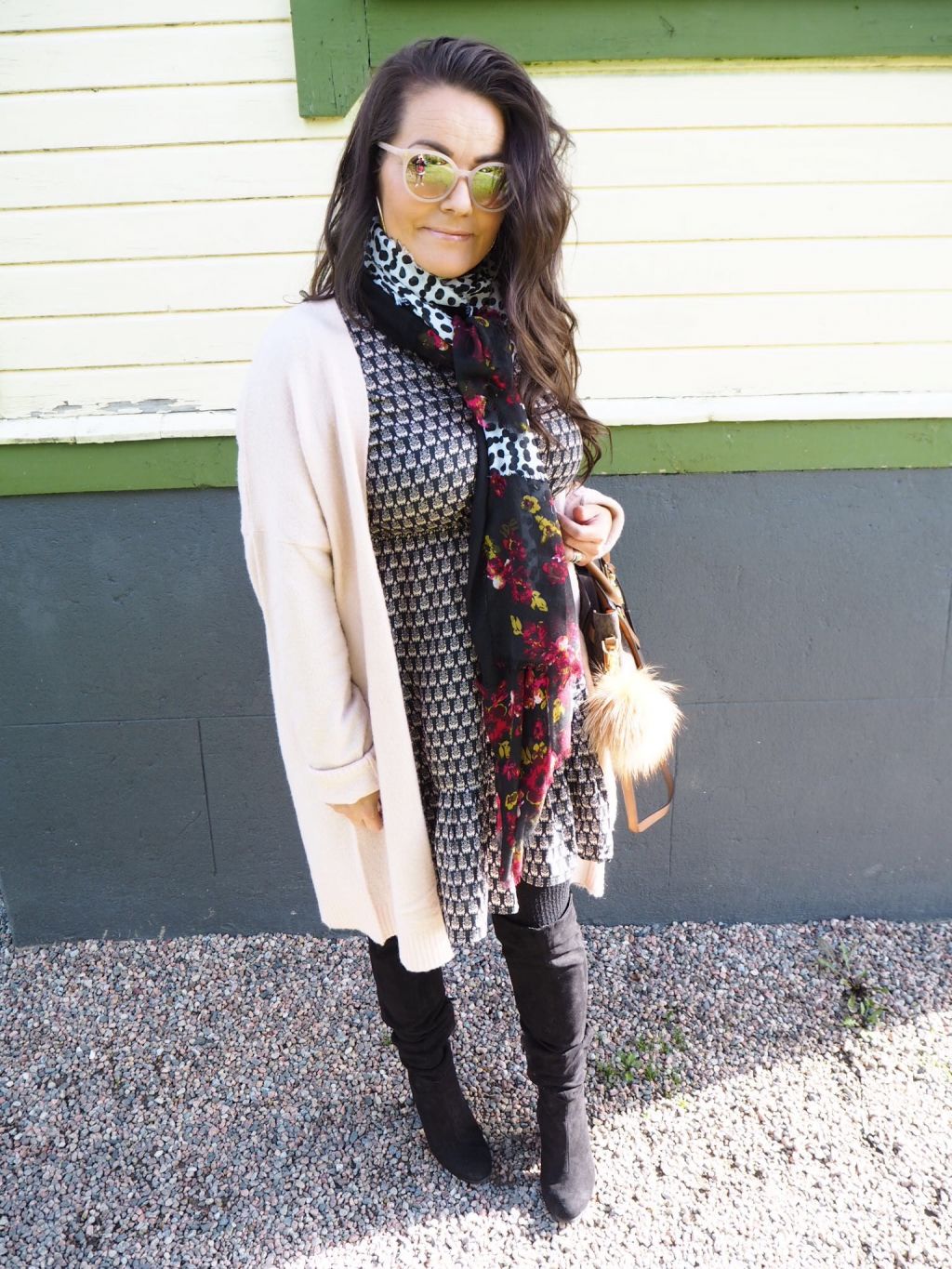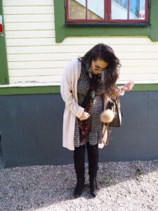 Ja så fick det lov att bli. Hörde när de diskuterade det här med trender och hur man ska klä sig….. Man ska klä sig som man känner för det. Ämen hur bra? >>Scarfen<< passade inte så jättebra till just detta men det var den jag hann ta i farten. Skulle hunnit byta till svarta väskan också – men när jag tittade i den så fick jag en chock. Visar jag er detta så förstår ni nivån på min handväskas innehåll kanske?