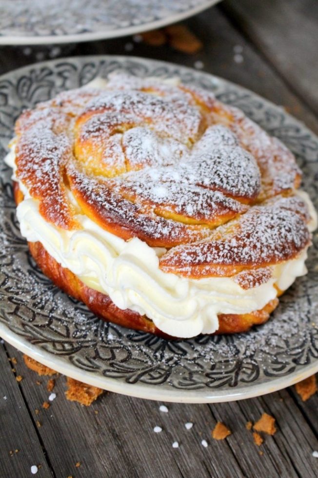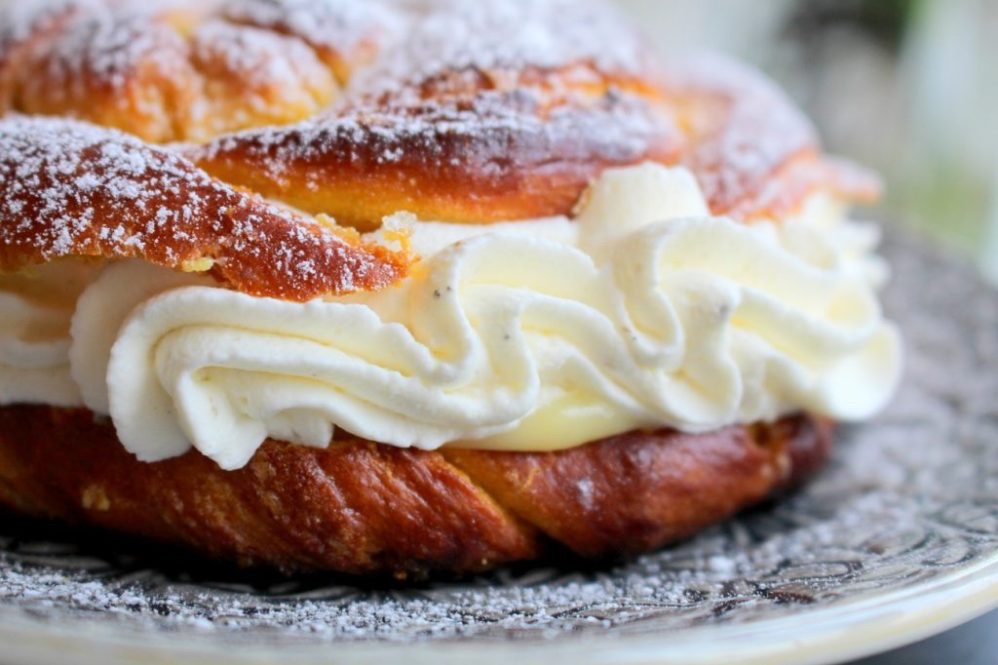 9) Dela bullarna i två delar. Fyll den understa delen med vaniljkräm. (Du kan givetvis också använda mandelmassa som du vispat i lite grädde). Spritsa eller klicka sedan på grädde.