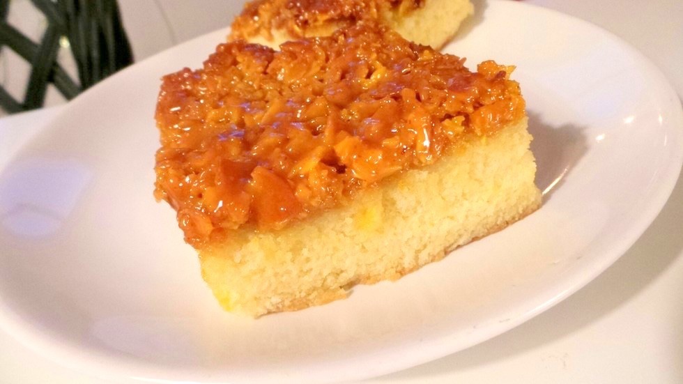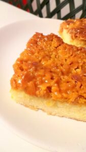 3) När kakan är klar och uttagen från ugnen, bred på glasyren och grädda ytterligare 10 minuter i ugnen tills kakan fått fin gyllenbrun färg. När kakan svalnat, skär kakan i fyrkanter med en vass varm blöt kniv.