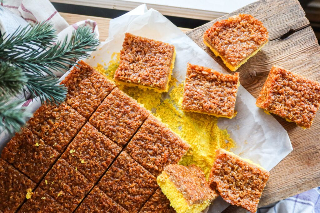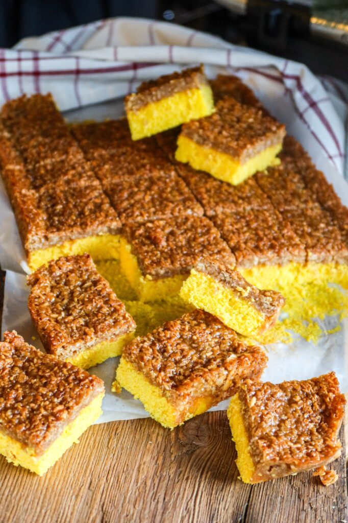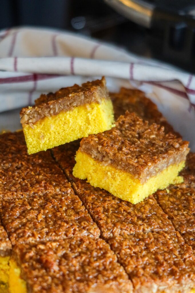 7. När kakan är klar och uttagen från ugnen, bred på glasyren och grädda ytterligare 10 minuter i ugnen tills kakan fått fin gyllenbrun färg. När kakan svalnat, skär kakan i fyrkanter.
